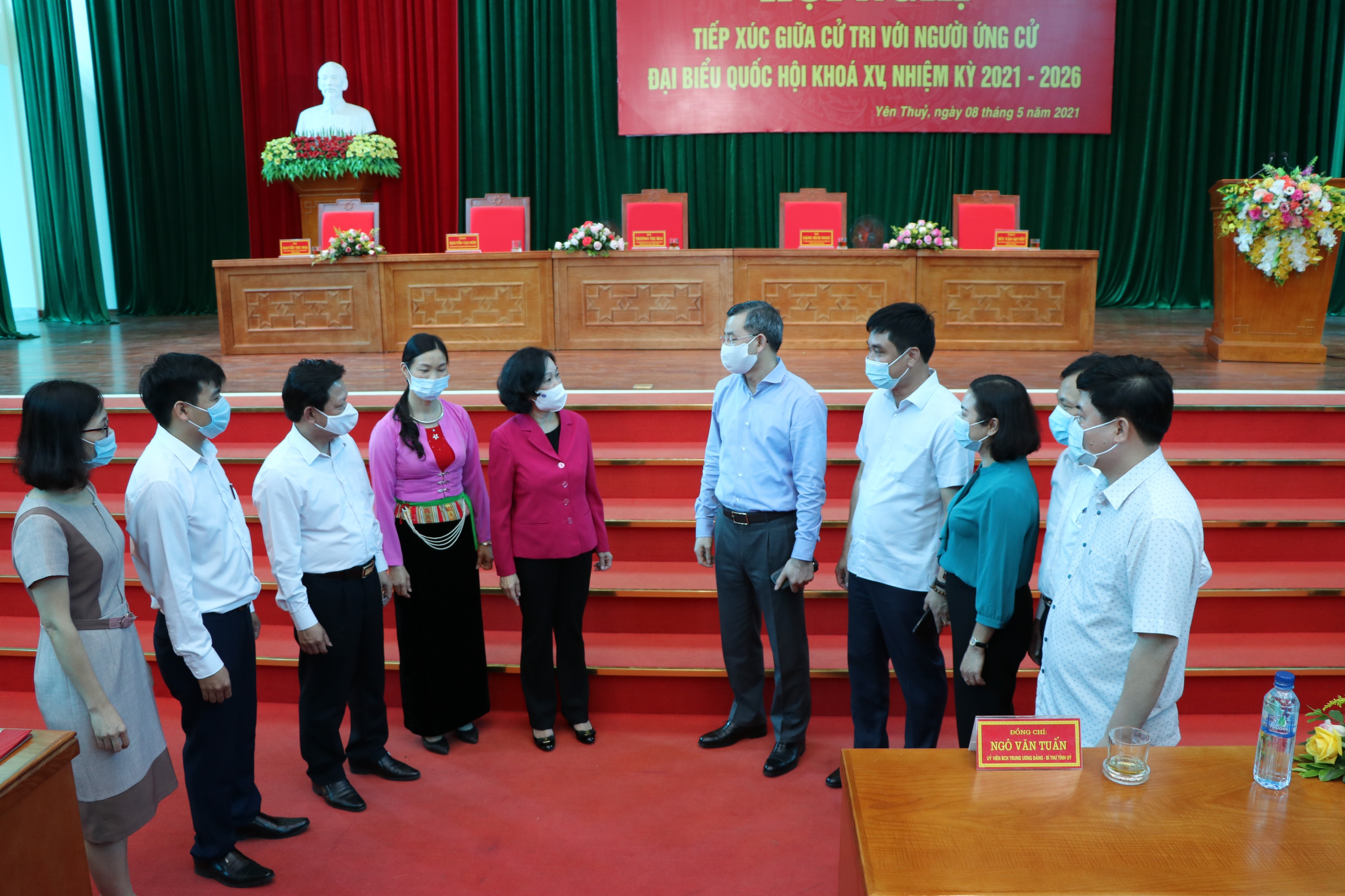 Đồng chí Trương Thị Mai, Ủy viên Bộ Chính trị, Bí thư Trung ương Đảng, Trưởng Ban Tổ chức Trung ương cùng các ứng cử viên đại biểu Quốc hội khoá XV tham dự hội nghị tiếp xúc giữa cử tri với người ứng cử đại biểu Quốc hội khóa XV, nhiệm kỳ 2021 - 2026 tại huyện Yên Thủy, tỉnh Hòa Bình _Ảnh: TTXVN