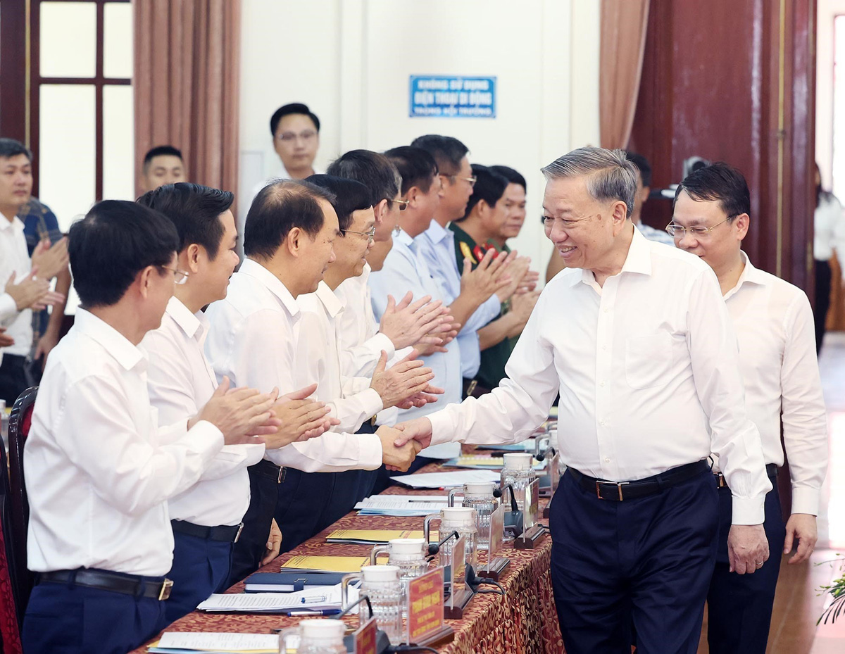 Tổng Bí thư Tô Lâm và các đại biểu tham dự buổi làm việc với Ban Thường vụ Tỉnh ủy Nam Định, Hà Nam, Ninh Bình _Ảnh: TTXVN