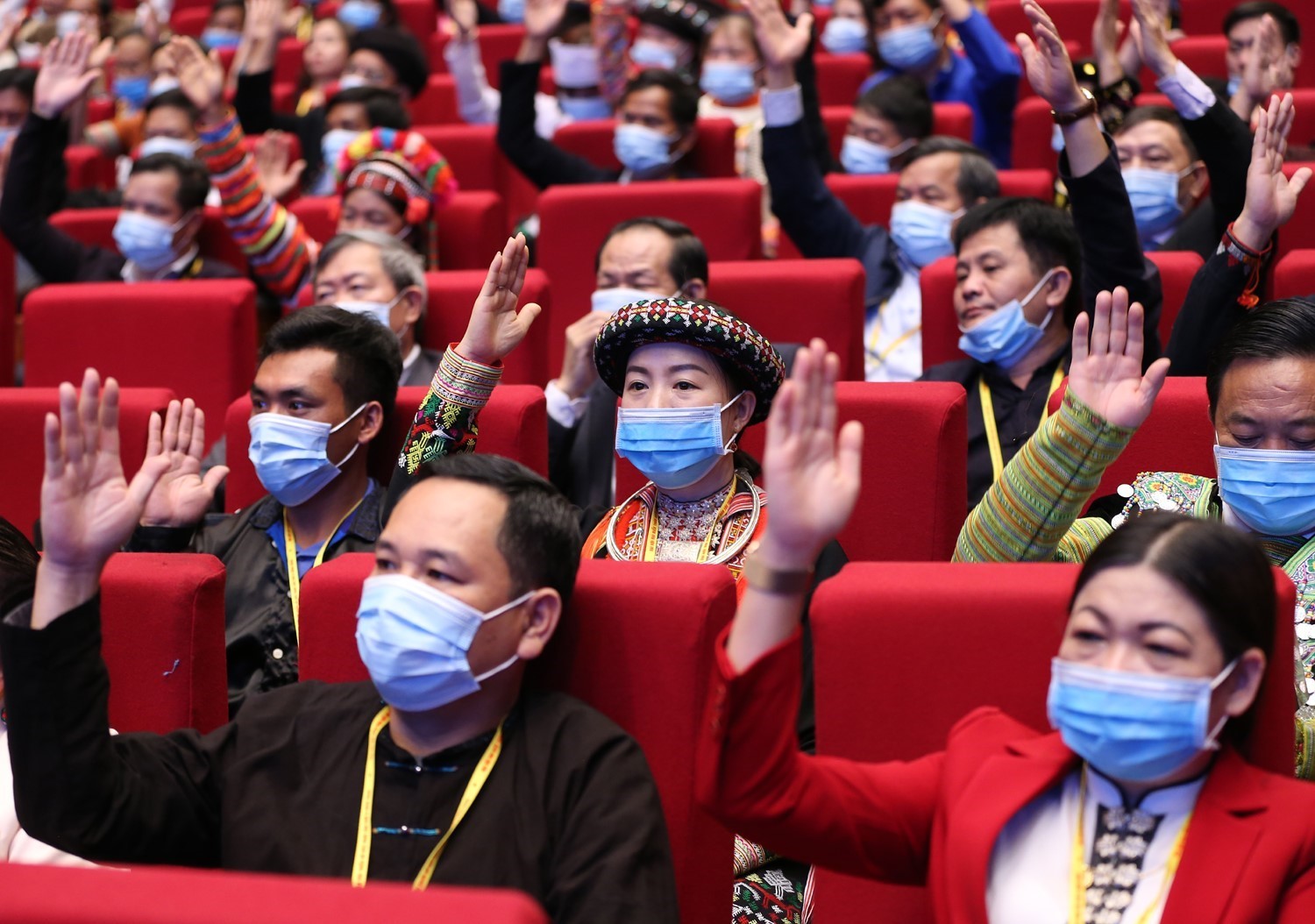 Các đại biểu biểu quyết tại Đại hội đại biểu toàn quốc các dân tộc thiểu số Việt Nam lần thứ II năm 2020 _Ảnh: TTXVN
