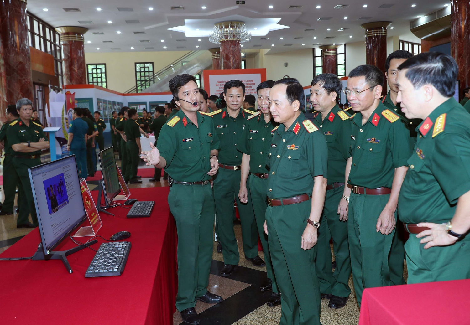 Thượng tướng Trịnh Văn Quyết, Ủy viên Trung ương Đảng, Phó Chủ nhiệm Tổng cục Chính trị Quân đội nhân dân Việt Nam và các đại biểu tham quan trưng bày, giới thiệu tài liệu tham khảo, giảng dạy chính trị của các đơn vị, tháng 7-2023 _Ảnh: TTXVN