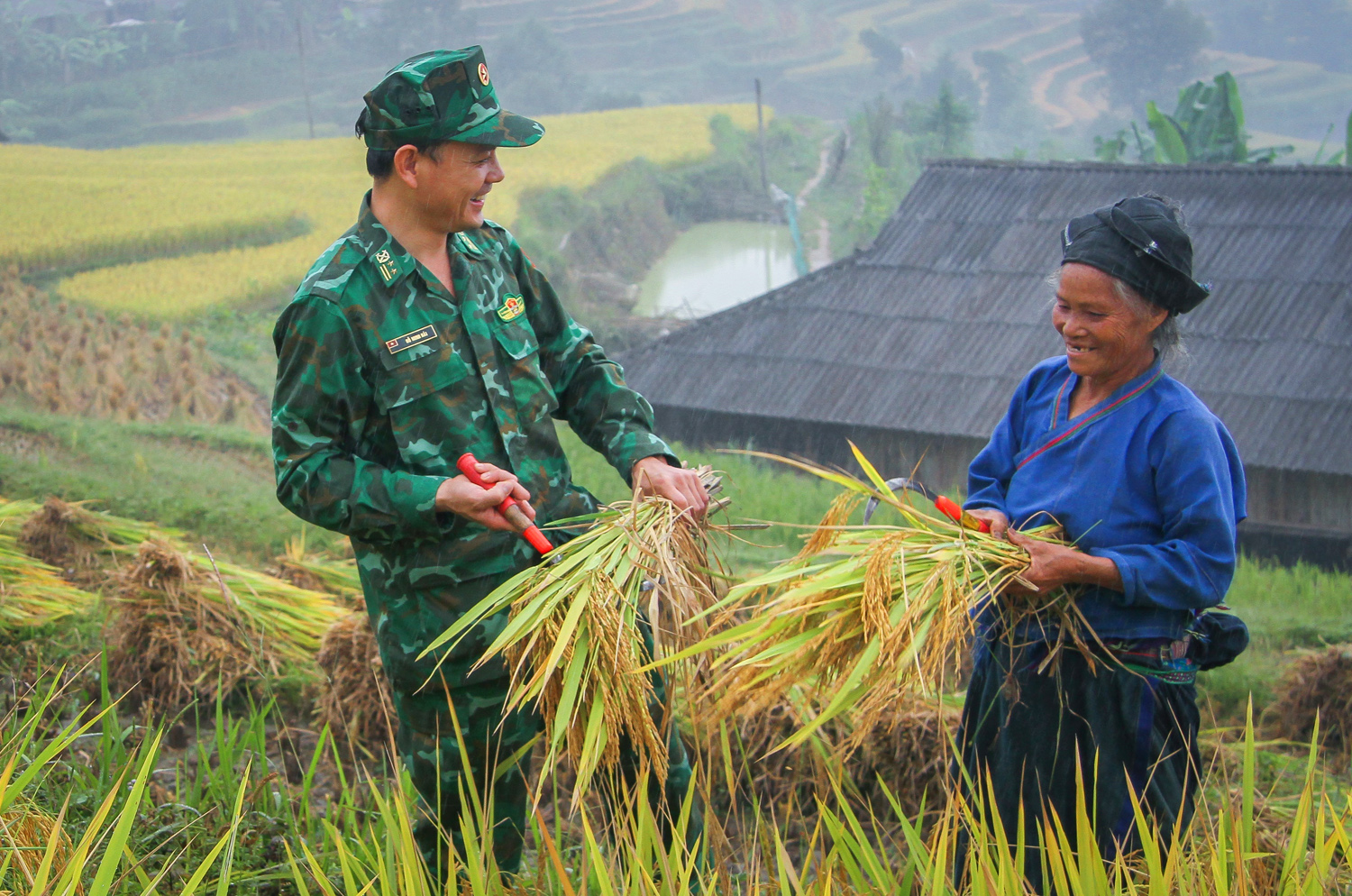Cán bộ, chiến sĩ Đồn Biên phòng Thàng Tín (tỉnh Hà Giang) giúp đồng bào thu hoạch lúa _Ảnh: TTXVN