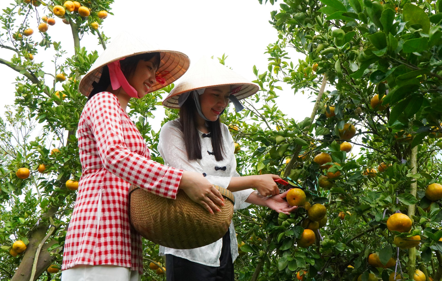 Khách du lịch trải nghiệm thu hoạch quýt hồng Lai Vung, sản phẩm du lịch sinh thái miệt vườn ở tỉnh Đồng Tháp_Ảnh: TTXVN