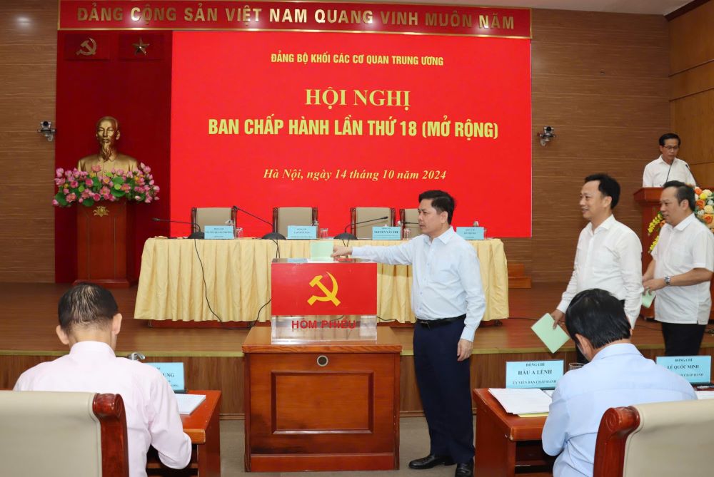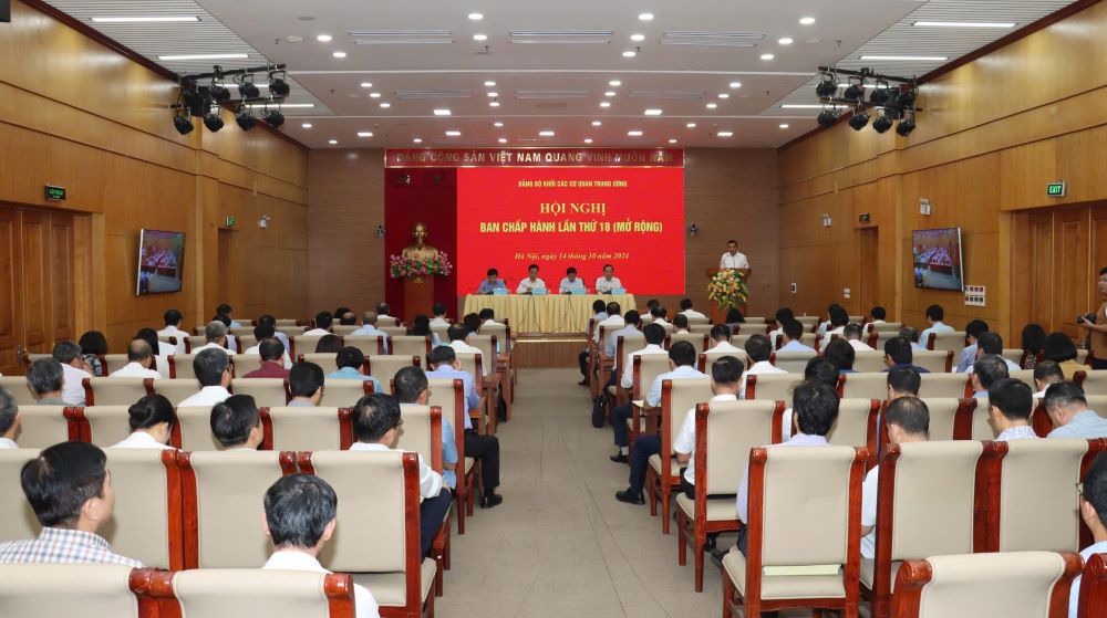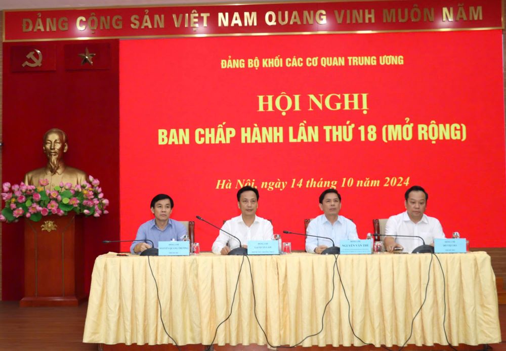 TCCS - Ngày 14-10-2024, thực hiện Quy chế làm việc và Chương trình công tác năm 2024, Ban Chấp hành Đảng bộ Khối các cơ quan Trung ương tổ chức Hội nghị Ban Chấp hành lần thứ 18 (mở rộng). Đồng chí Nguyễn Văn Thể, Ủy viên Trung ương Đảng, Bí thư Đảng ủy Khối các cơ quan Trung ương chủ trì hội nghị.