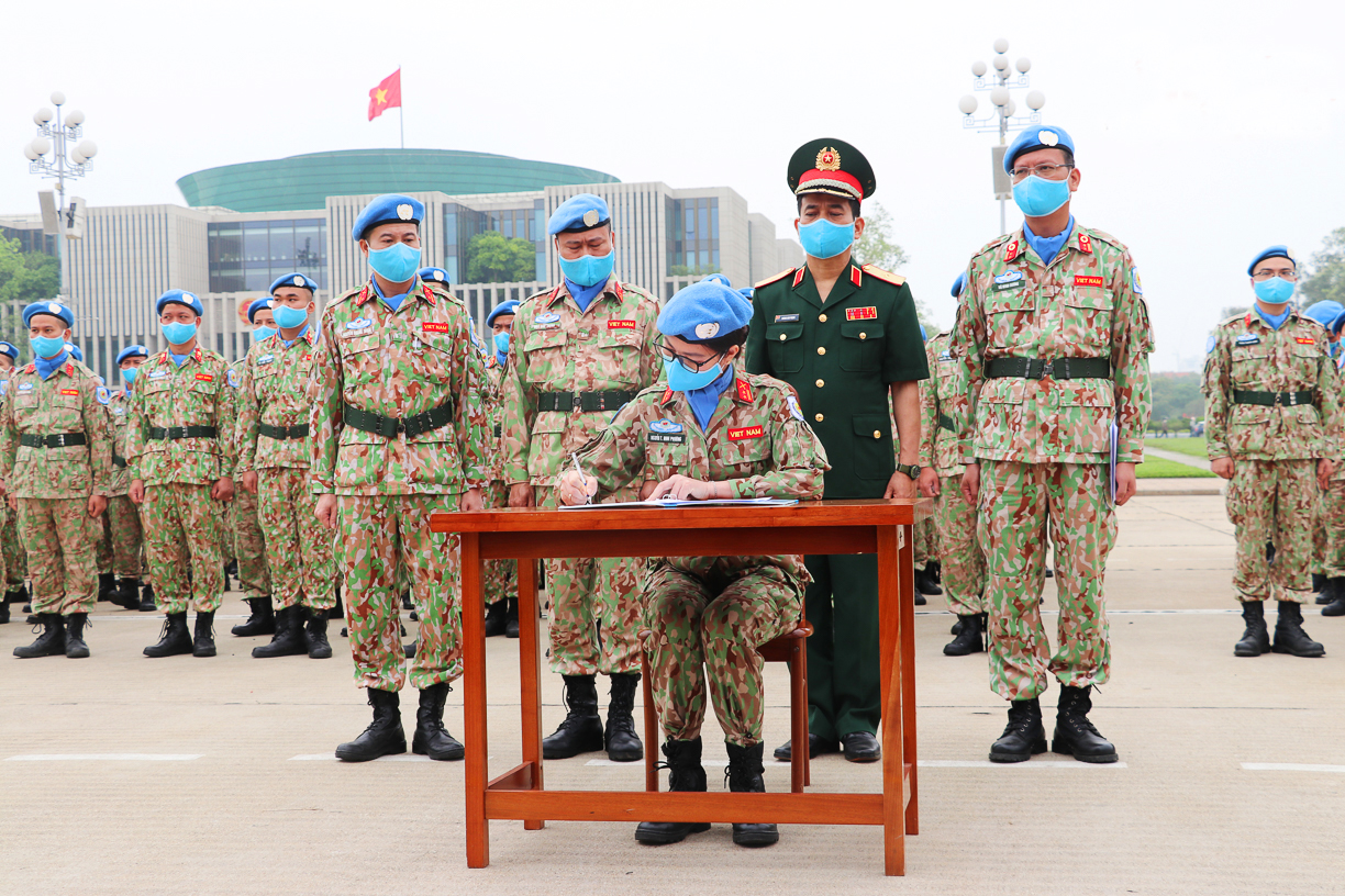 Tại Lăng Chủ tịch Hồ Chí Minh, Cục Gìn giữ hòa bình Việt Nam (Bộ Quốc phòng) tổ chức Lễ dâng hương và phát động thi đua của Đội Công binh số 1 và Bệnh viện dã chiến cấp 2 số 4 trước khi lên đường thực hiện nhiệm vụ gìn giữ hòa bình Liên hợp quốc_Ảnh: TTXVN