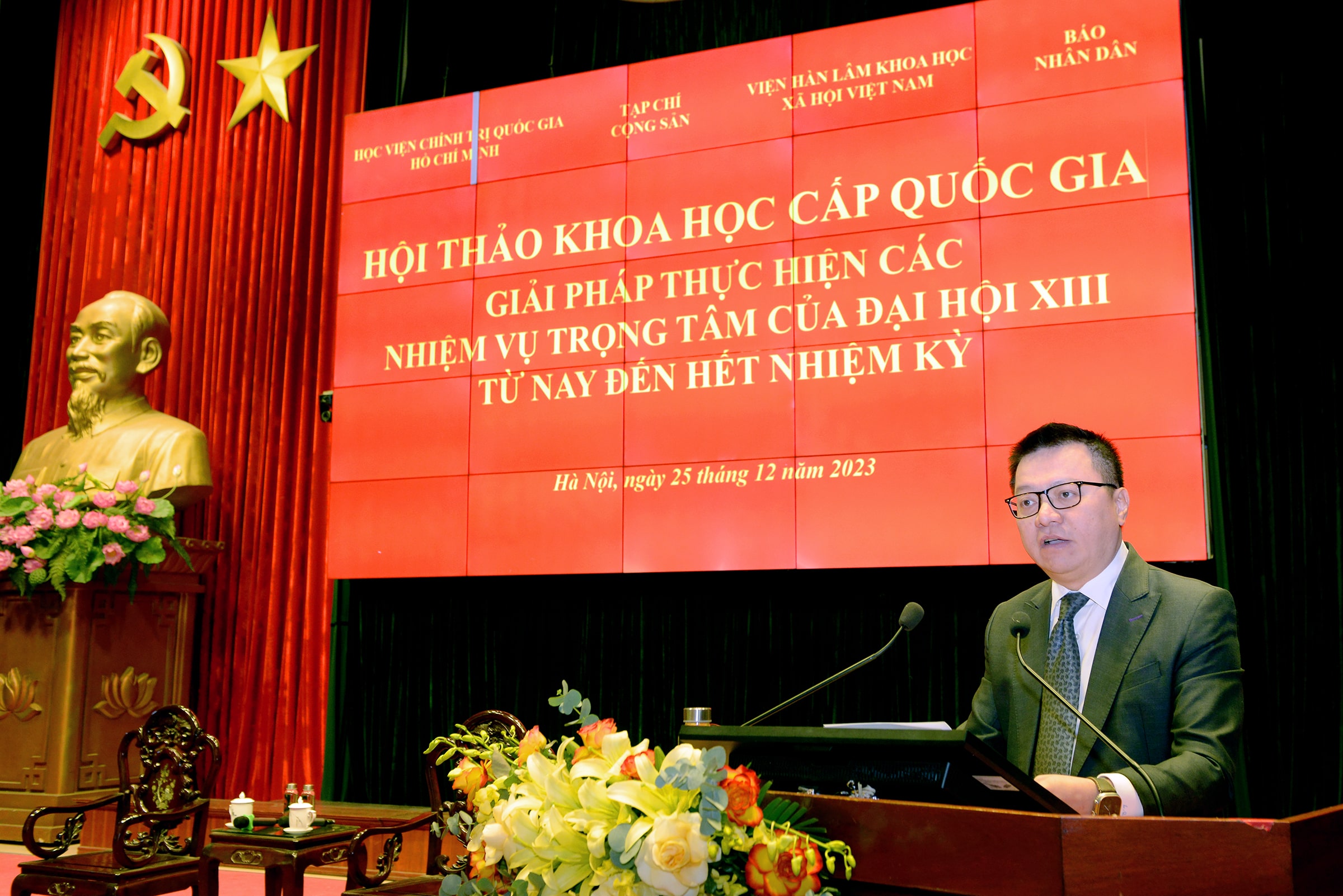 TCCS - Ngày 25-12-2023, tại Hà Nội, Học viện Chính trị quốc gia Hồ Chí Minh, Bộ Biên tập Tạp chí Cộng sản, Viện Hàn lâm Khoa học xã hội Việt Nam, Báo Nhân dân tổ chức Hội thảo khoa học cấp quốc gia: “Giải pháp thực hiện các nhiệm vụ trọng tâm của Đại hội XIII từ nay đến hết nhiệm kỳ”.