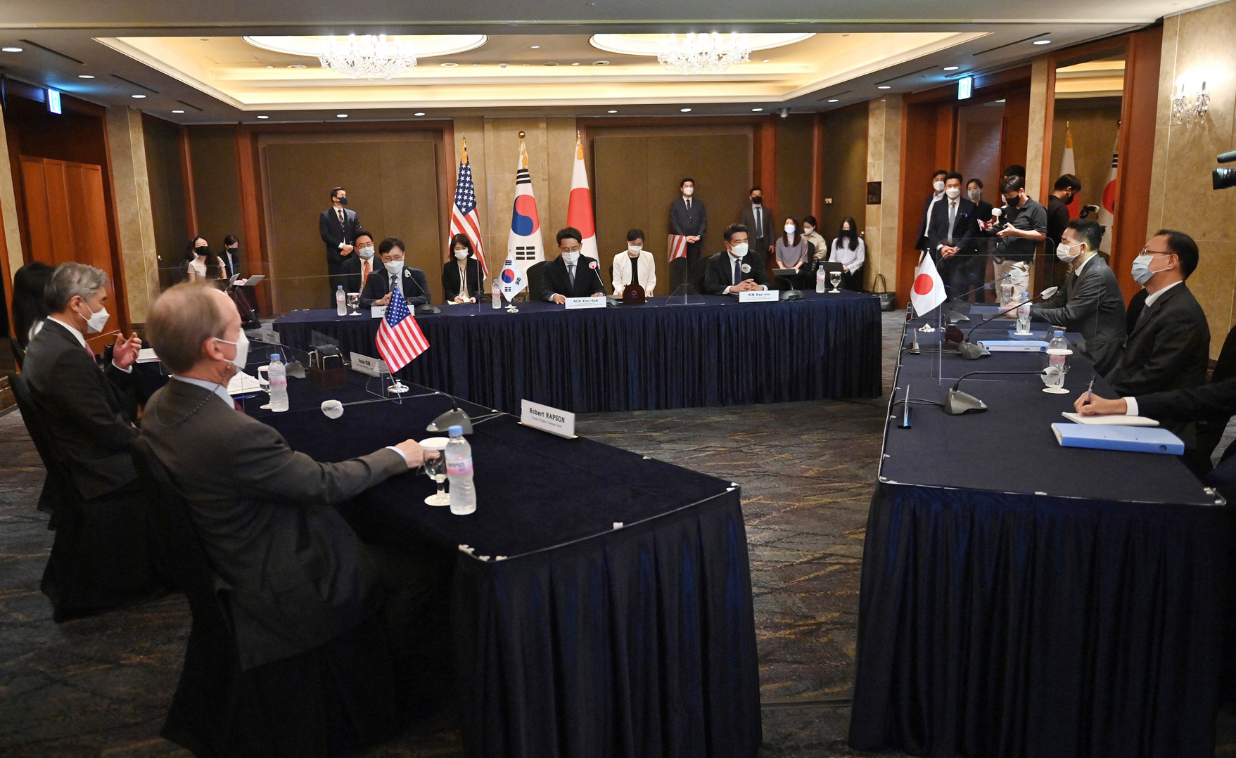Toàn cảnh cuộc gặp ba bên giữa Đại diện đặc biệt của Hàn Quốc về hòa bình, an ninh trên bán đảo Triều Tiên Noh Kyu-duk (giữa), Vụ trưởng Vụ châu Á và châu Đại Dương của Bộ Ngoại giao Nhật Bản Takehiro Funakoshi (phải) và Đặc phái viên Mỹ phụ trách vấn đề Triều Tiên Sung Kim (trái) ở Seoul, ngày 21-6-2021_Ảnh: AFP/TTXVN