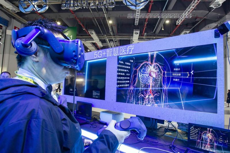 Khách tham quan trải nghiệm thực tế ảo được hỗ trợ bởi công nghệ 5G của China Mobile để kiểm tra thông tin y tế trực tuyến trong một triển lãm công nghệ cao ở Thượng Hải, Trung Quốc_Ảnh: chinadaily.com.cn