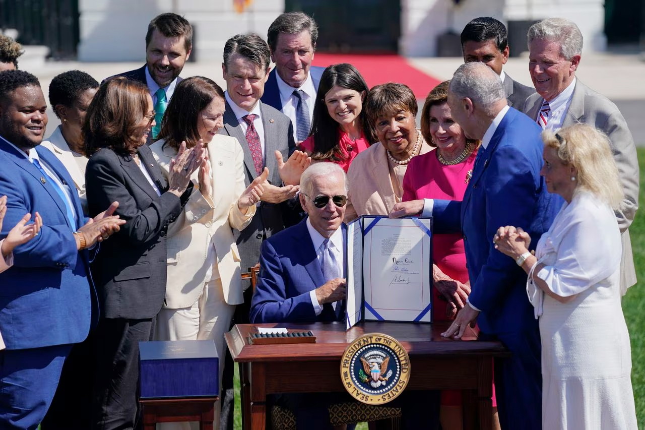 Tổng thống Mỹ Joe Biden ký thông qua Đạo luật chip và khoa học 2022 để thúc đẩy sản xuất công nghệ cao trong nước, tại Nhà Trắng, ngày 9-8-2022 _Ảnh: Reuters