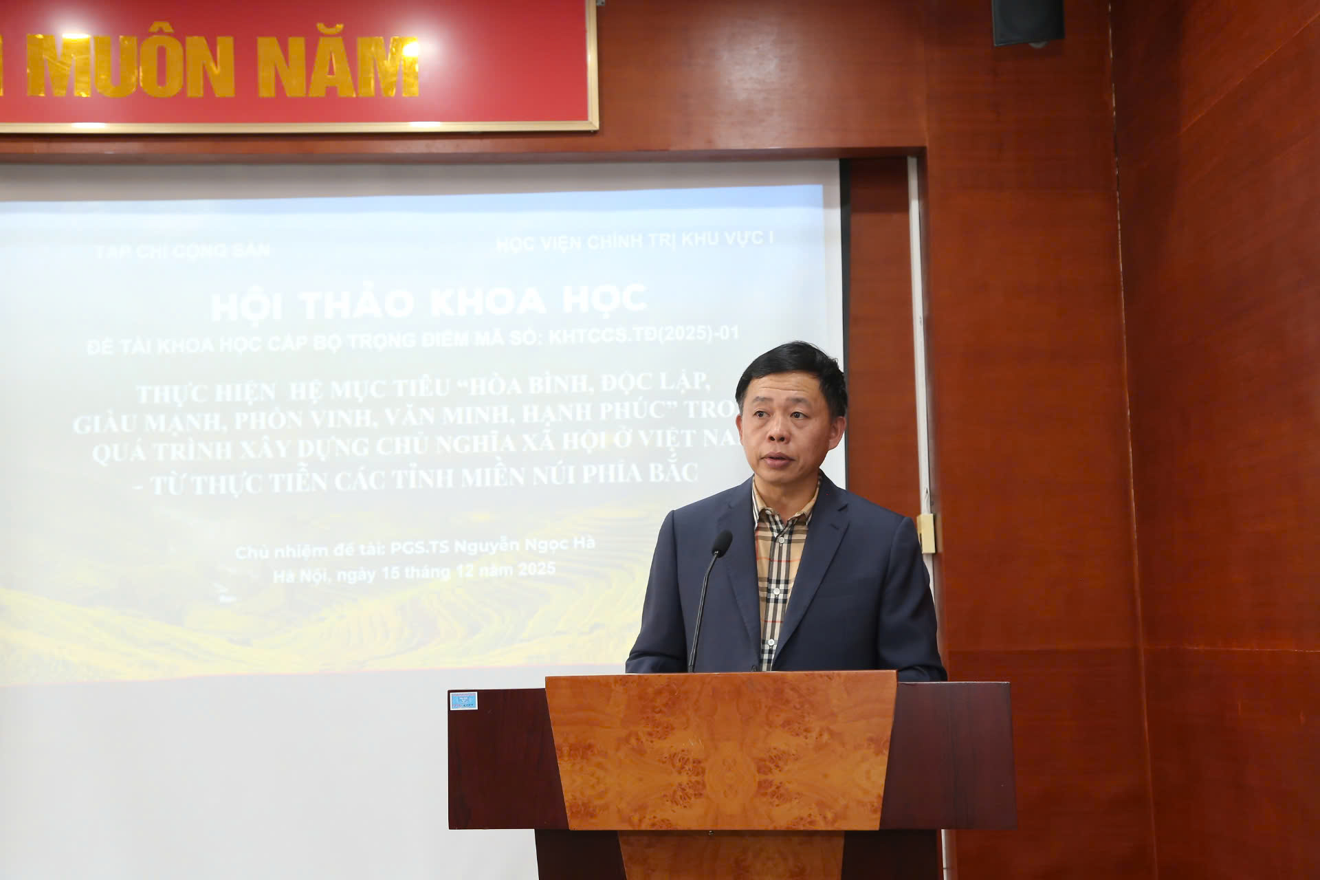 TCCS - Ngày 15-12-2025, tại Hà Nội, Bộ Biên tập Tạp chí Cộng sản phối hợp với Học viện Chính trị khu vực I tổ chức Hội thảo khoa học "Thực hiện mục tiêu “Hòa bình, độc lập, giàu mạnh, phồn vinh, văn minh, hạnh phúc” trong quá trình xây dựng chủ nghĩa xã hội Việt Nam - Từ thực tiễn các tỉnh miền núi phía Bắc”. Hội thảo là diễn đàn khoa học để các chuyên gia, nhà khoa học, nhà quản lý thảo luận, trao đổi, làm rõ các vấn đề nhằm xây dựng, đề xuất định hướng, giải pháp thúc đẩy phát triển nhanh và bền vững các tỉnh miền núi phía Bắc, góp phần hiện thực hóa mục tiêu xây dựng chủ nghĩa xã hội Việt Nam trong giai đoạn mới.