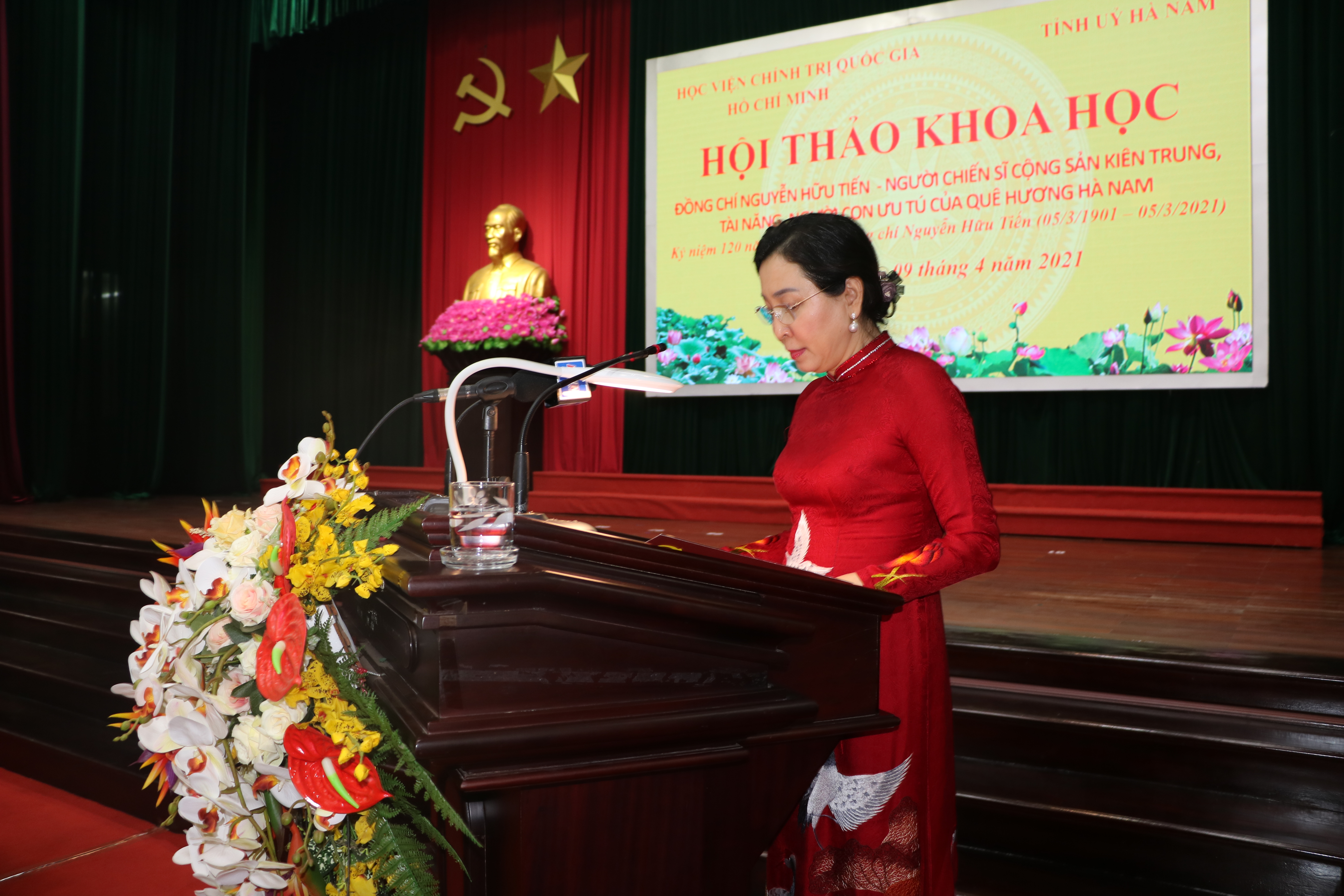 Phát biểu chào mừng hội thảo, đồng chí Lê Thị Thủy, Ủy viên Trung ương Đảng, Bí thư Tỉnh uỷ, Trưởng Đoàn Đại biểu Quốc hội tỉnh Hà Nam khẳng định, Hội thảo: “Đồng chí Nguyễn Hữu Tiến - Người chiến sĩ cộng sản kiên trung, tài năng, người con ưu tú của quê hương Hà Nam” là hoạt động có ý nghĩa đặc biệt quan trọng, thể hiện sự kính trọng, biết ơn các vị tiền bối cách mạng đã có nhiều đóng góp cho quê hương, đất nước; là hoạt động thiết thực kỷ niệm 120 năm Ngày sinh đồng chí Nguyễn Hữu Tiến, người chiến sĩ cách mạng kiên cường, người con ưu tú của quê hương Hà Nam. Đồng chí đã chiến đấu, hy sinh vì sự nghiệp cách mạng vẻ vang của Đảng, của dân tộc, vì độc lập, tự do của Tổ quốc, vì hạnh phúc của nhân dân. Quá trình tham gia hoạt động cách mạng của đồng chí gắn liền với những chặng đường cách mạng cam go, gian khổ của Đảng, dân tộc và quê hương Hà Nam.