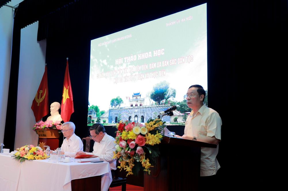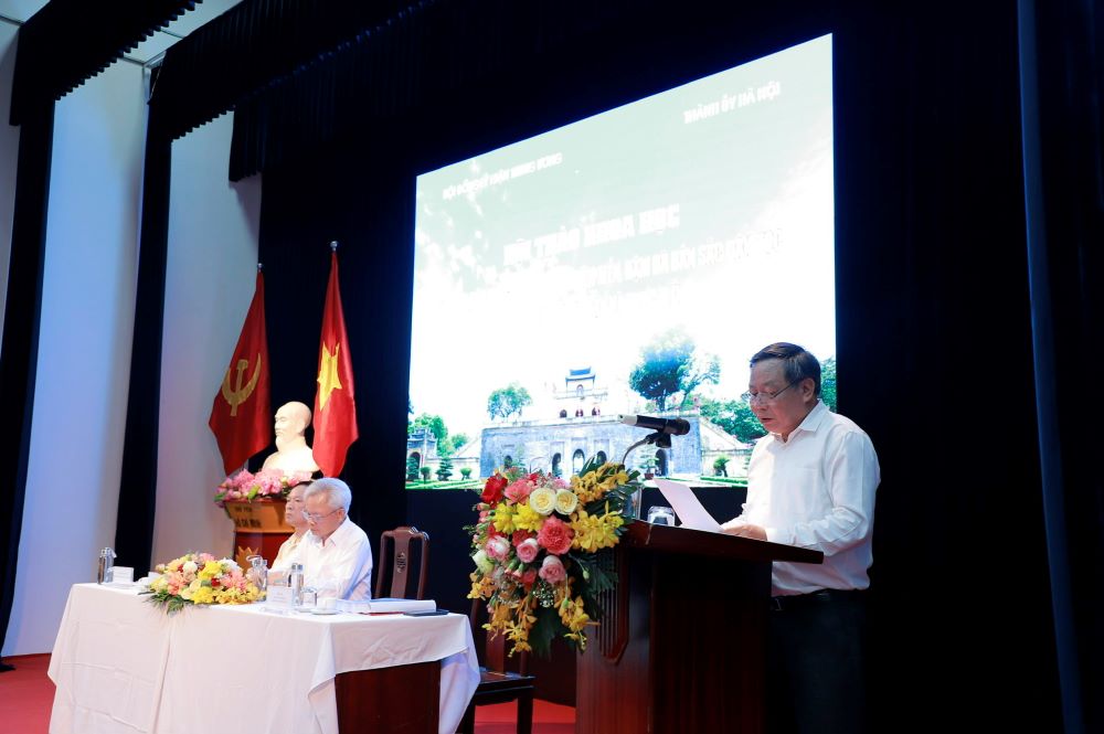Phát biểu tại hội thảo, TS. Nguyễn Văn Phong, Phó Bí thư Thành ủy Hà Nội nhấn mạnh, với chiều dài lịch sử, bề dày văn hiến nghìn năm, Hà Nội luôn luôn nhận thức sâu sắc vấn đề văn hóa vừa là nhiệm vụ trước mắt, vừa là nhiệm vụ cơ bản và lâu dài; văn hóa đang trở thành trung tâm trong chính sách phát triển của Hà Nội; quan điểm bảo đảm phát triển hài hòa giữa kinh tế và văn hóa; phát triển văn hóa vì sự hoàn thiện nhân cách con người và xây dựng con người để phát triển văn hóa. Vì thế, hội thảo là dịp để Hà Nội có cơ hội giao lưu, trao đổi, thảo luận giới thiệu với các đại biểu về mảnh đất, con người Thủ đô với truyền thống trong lịch sử và hiện tại. Đồng chí Nguyễn Văn Phong mong muốn hội thảo sẽ cung cấp thêm các luận cứ quan trọng để Đảng bộ Thành phố Hà Nội nghiên cứu, xây dựng văn kiện Đại hội XVIII Đảng bộ Thành phố Hà Nội trong thời gian tới một cách bài bản, chất lượng.