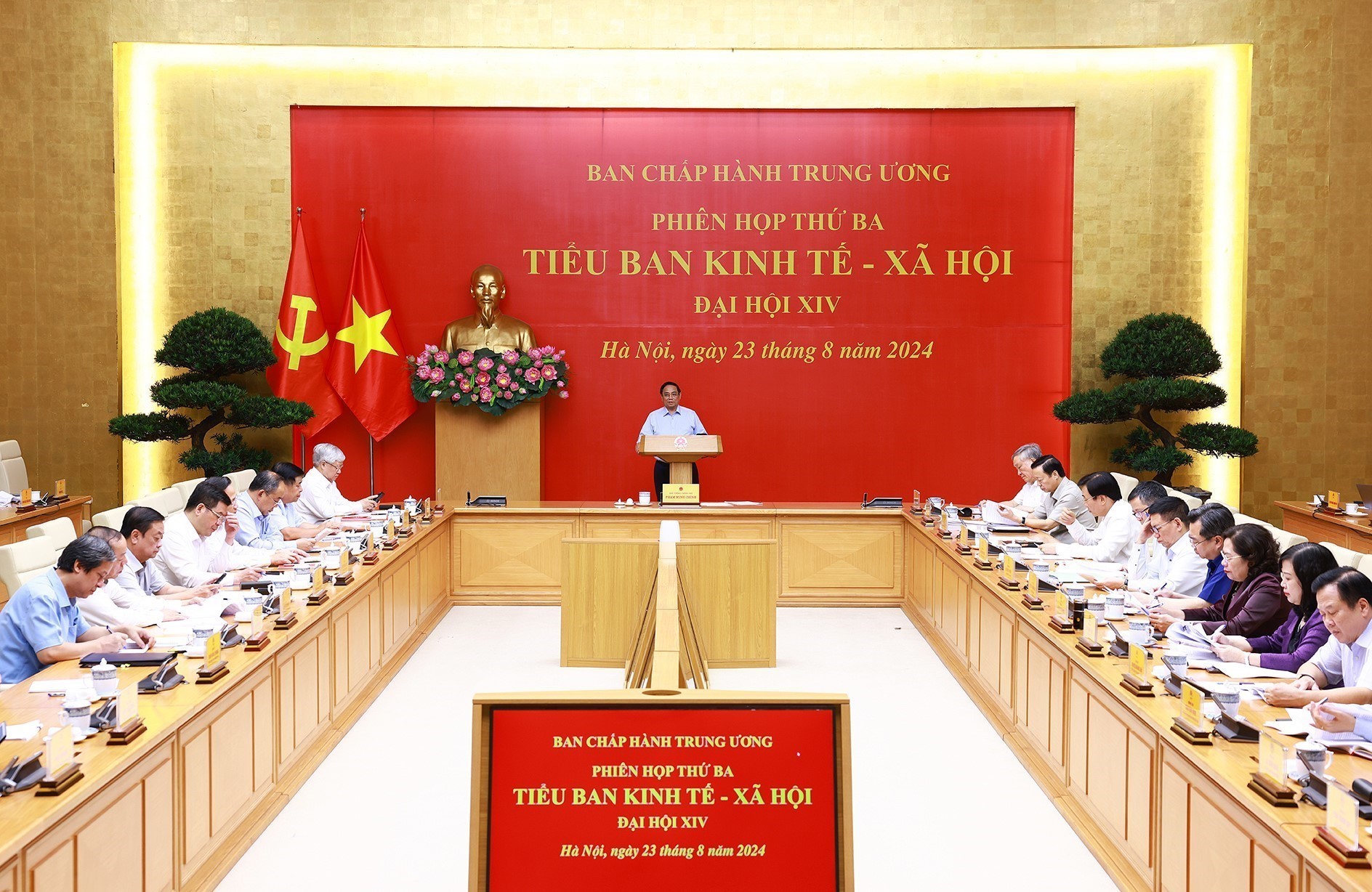 TCCS - Ngày 23-8-2024, Ủy viên Bộ Chính trị, Thủ tướng Chính phủ Phạm Minh Chính, Trưởng Tiểu ban Kinh tế - Xã hội Đại hội đại biểu toàn quốc lần thứ XIV của Đảng (Tiểu ban) chủ trì phiên họp lần thứ 3 để rà soát các công việc, kết quả hoạt động của Tiểu ban; góp ý đối với dự thảo Báo cáo đánh giá 5 năm thực hiện Chiến lược phát triển kinh tế - xã hội 10 năm 2021 - 2030, phương hướng, nhiệm vụ phát triển kinh tế - xã hội 5 năm 2026 - 2030, trước khi báo cáo Bộ Chính trị và trình Hội nghị Trung ương 10 khóa XIII.
