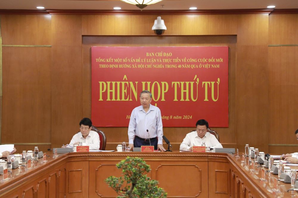 TCCS - Ngày 22-8-2024, tại Hà Nội, Ban Chỉ đạo Tổng kết một số vấn đề lý luận và thực tiễn về công cuộc đổi mới theo định hướng xã hội chủ nghĩa trong 40 năm qua ở Việt Nam (Ban Chỉ đạo Tổng kết 40 năm đổi mới) đã tổ chức Phiên họp thứ tư. Tổng Bí thư, Chủ tịch nước Tô Lâm, Trưởng Ban Chỉ đạo Tổng kết 40 năm đổi mới chủ trì Phiên họp.
