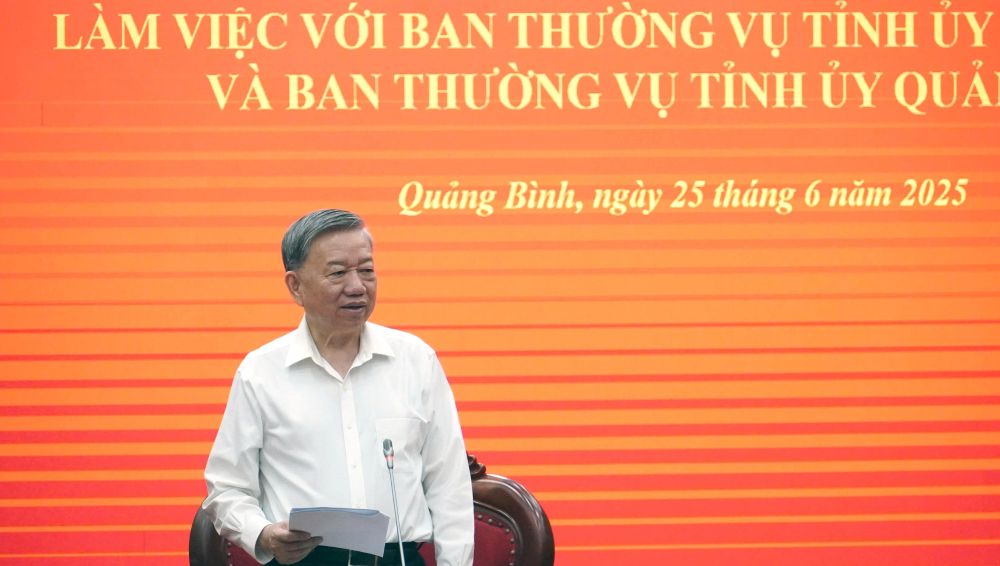 TCCS - Ngày 25-6-2025, đồng chí Tô Lâm, Tổng Bí thư Ban Chấp hành Trung ương Đảng và đoàn công tác Trung ương đã có buổi làm việc với Ban Thường vụ Tỉnh ủy Quảng Bình và Ban Thường vụ Tỉnh ủy Quảng Trị.