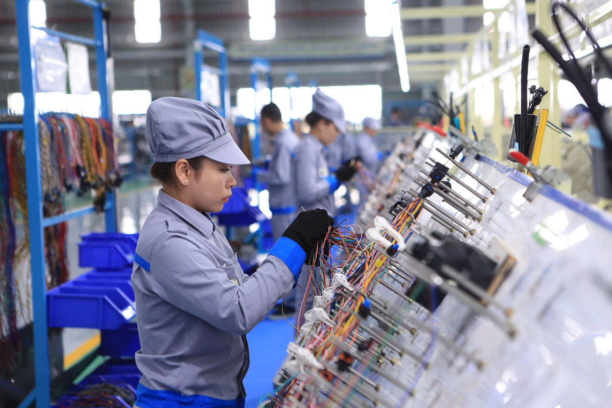 Công nhân làm việc tại dây chuyền lắp ráp hệ thống dây điện ô tô của Tập đoàn THACO ở thành phố Đà Nẵng_Ảnh: TTXVN