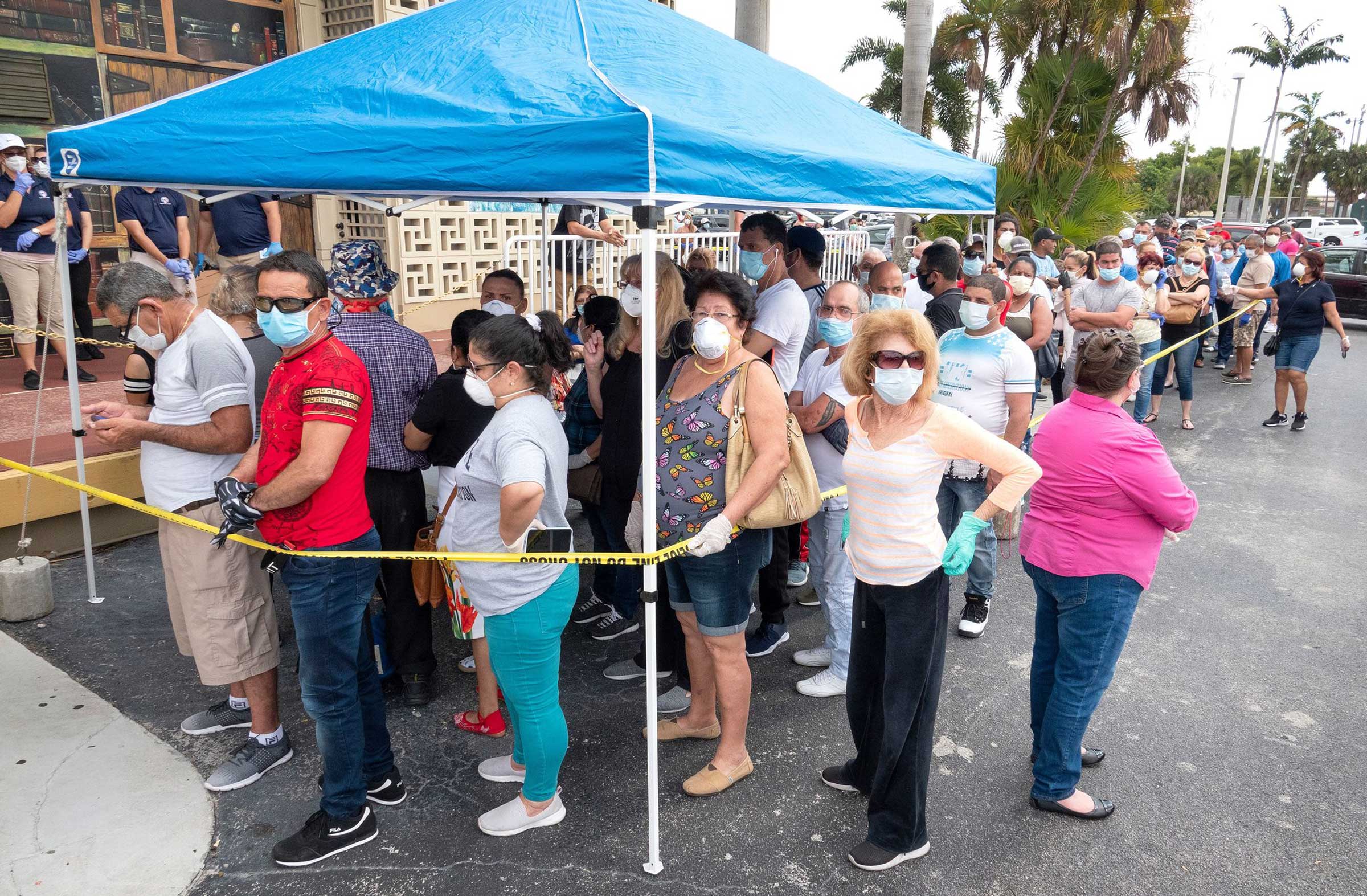 Người lao động Mỹ xếp hàng xin trợ cấp thất nghiệp do ảnh hưởng của dịch COVID-19 tại thành phố Hialeah, Florida, ngày 7-4-2020 _Ảnh: EPA