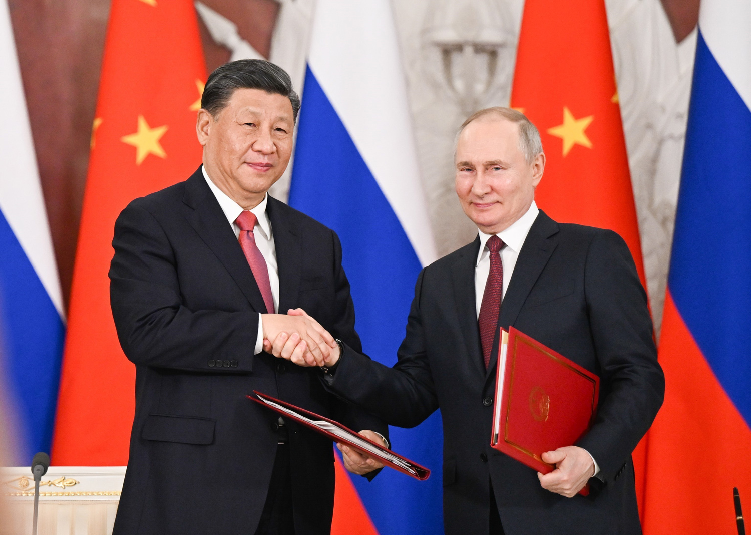 Tổng thống Nga Vladimir Putin và Chủ tịch Trung Quốc Tập Cận Bình tại Lễ ký tuyên bố chung về tăng cường quan hệ Đối tác hợp tác chiến lược toàn diện Nga - Trung Quốc trong thời đại mới, ở Moskva (Nga), ngày 21-3-2023 _Ảnh: THX/ TTXVN