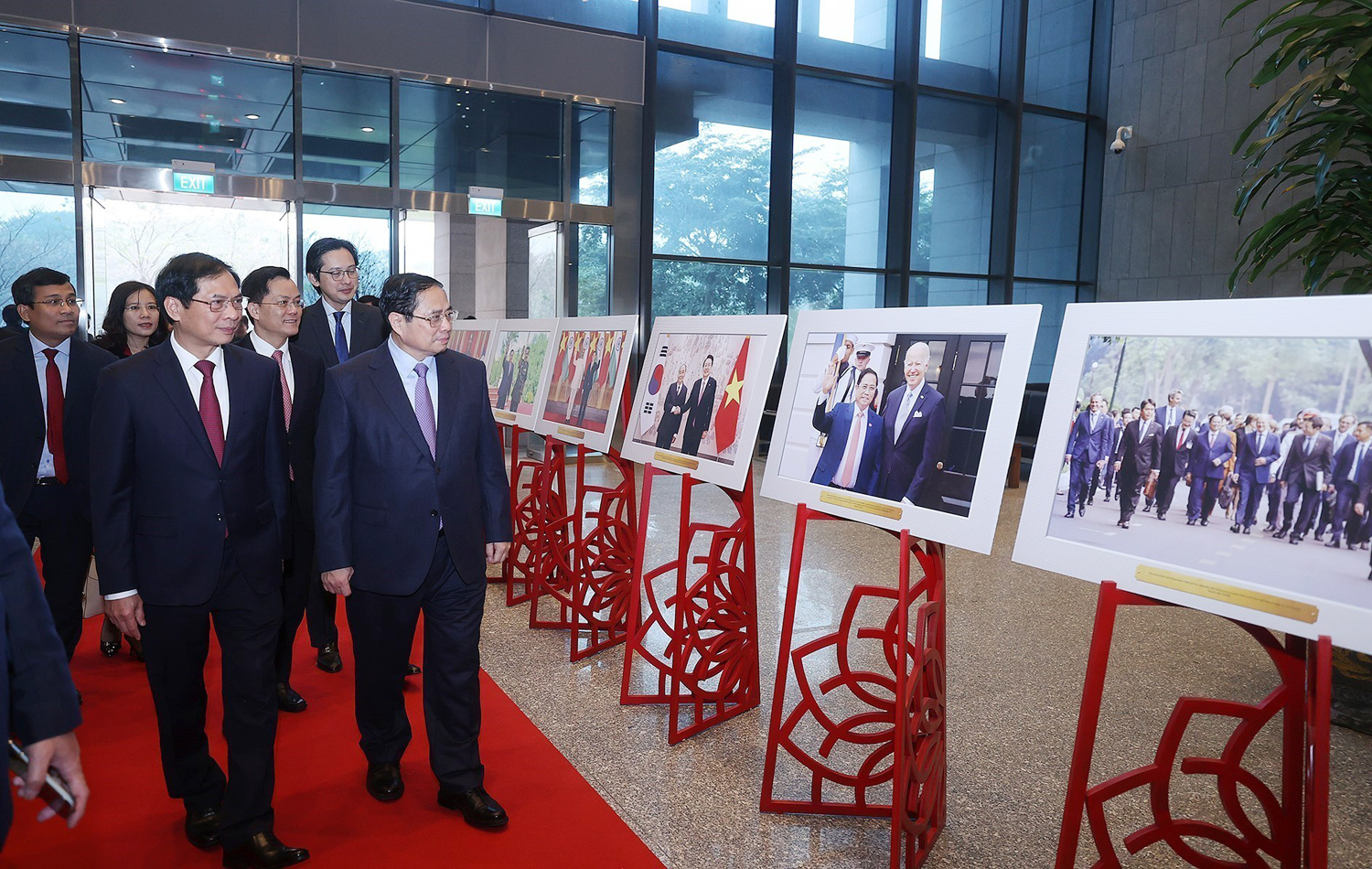 Ủy viên Bộ Chính trị, Thủ tướng Chính phủ Phạm Minh Chính tham quan trưng bày ảnh về các hoạt động đối ngoại tại Hội nghị Tổng kết công tác năm 2022 và triển khai phương hướng, nhiệm vụ năm 2023 của ngành ngoại giao, ngày 10-1-2023 _Ảnh: Tư liệu