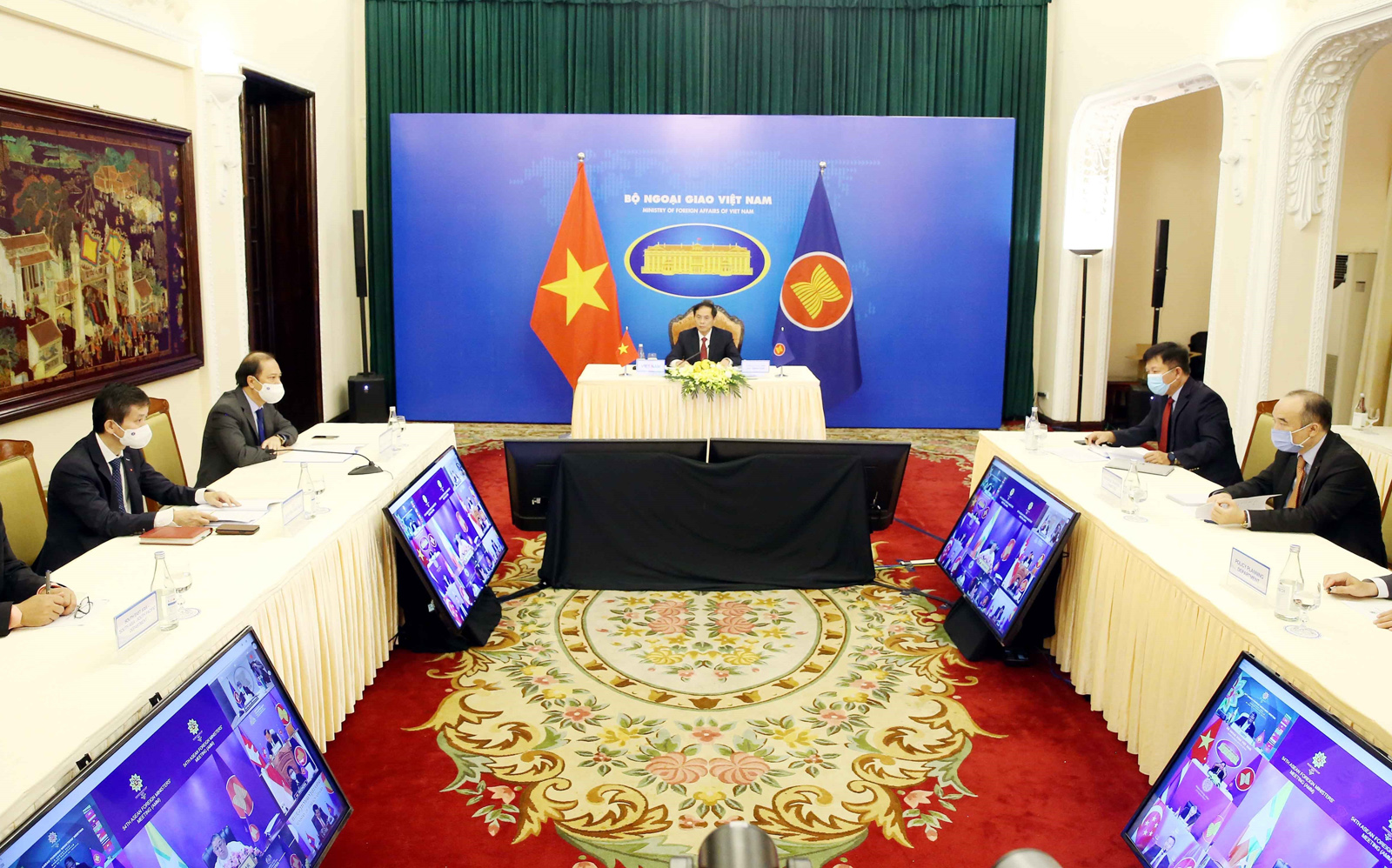 Ủy viên Trung ương Đảng, Bộ trưởng Bộ Ngoại giao Bùi Thanh Sơn tham dự Hội nghị Bộ trưởng Ngoại giao ASEAN lần thứ 54 (AMM 54) theo hình thức trực tuyến, ngày 2-8-2021 _Ảnh: TTXVN