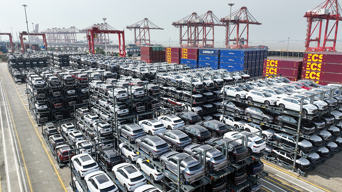 Xe ô tô chạy bằng năng lượng mới chờ xuất khẩu tại cảng Thái Thương, tỉnh Giang Tô, Trung Quốc _Ảnh: THX/TTXVN