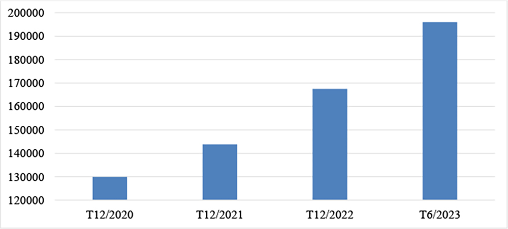 Dư nợ cho vay ngành lúa, gạo toàn quốc tính tới thời điểm cuối các năm giai đoạn 2020 - 2022 và tháng 6-2023 (Đơn vị: Tỷ đồng)
