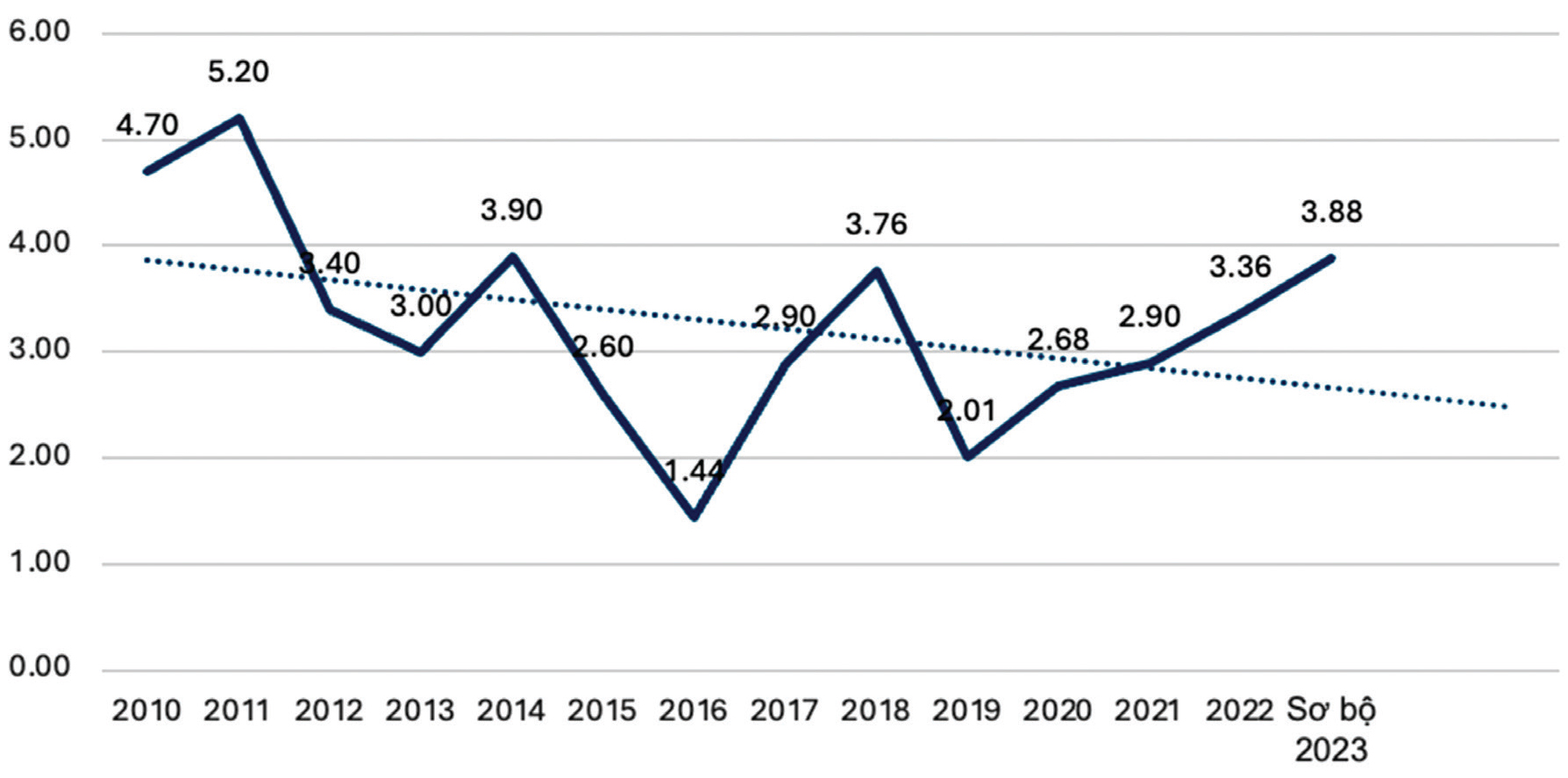 Tốc độ tăng trưởng GDP nông nghiệp tuy có giảm, nhưng vẫn đạt khá cao, bình quân khoảng 3,27%/năm trong giai đoạn từ 2010 - 2023. Giai đoạn 2016 - 2019 là giai đoạn ngành nông nghiệp đạt mức tăng trưởng thấp nhất (năm 2016 chỉ đạt 1,44% và năm 2019 chỉ đạt 2,01%)(3). Tuy nhiên, từ giai đoạn năm 2019 đến nay, tốc độ tăng trưởng khu vực nông nghiệp đã không ngừng tăng lên. Đặc biệt là trong và sau giai đoạn dịch COVID-19 diễn ra, nông nghiệp đã chứng tỏ vị thế quan trọng là bệ đỡ của nền kinh tế nước ta với tốc độ tăng trưởng thuộc loại cao của thế giới (Xem hình 2).