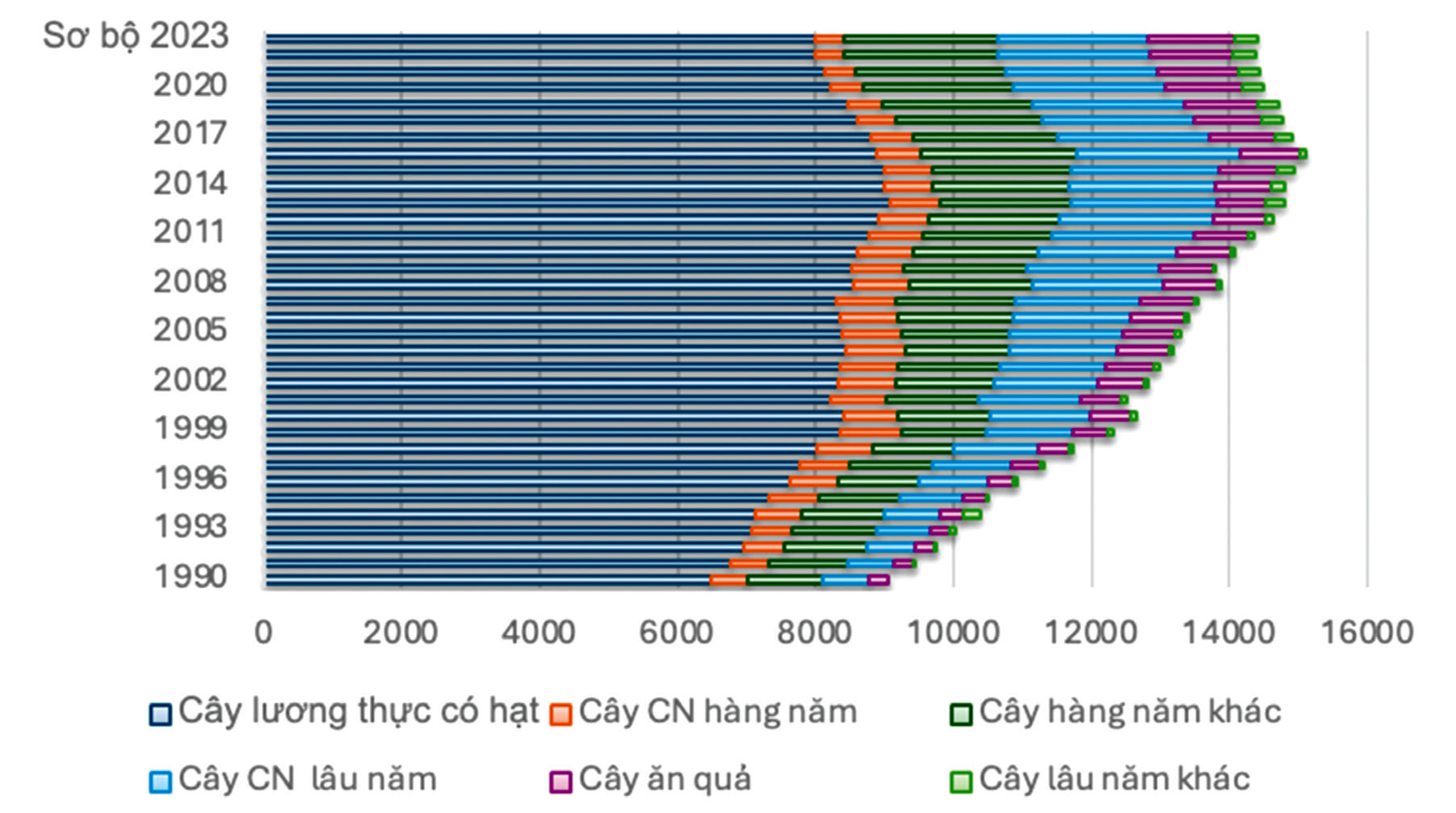 Cơ cấu sản xuất được điều chỉnh theo hướng phát huy lợi thế của mỗi địa phương và cả nước, gắn với nhu cầu thị trường. Theo thời gian, cơ cấu cây trồng của nước ta đã có sự chuyển dịch mạnh mẽ, theo hướng giảm dần diện tích trồng cây lương thực có hạt và cây công nghiệp hàng năm sang gieo trồng các loại cây trồng khác (cây công nghiệp lâu năm và cây dược liệu, cây ăn quả) hoặc chuyển sang đất nuôi trồng thủy sản nhằm đạt được hiệu quả kinh tế cao hơn nhưng đồng thời cũng giảm áp lực lên nguồn tài nguyên thiên nhiên, góp phần bảo vệ môi trường sinh thái (Xem hình 3). Bên cạnh đó, Việt Nam cũng tập trung vào phát triển nuôi trồng các loại thủy sản có lợi thế (như tôm, cá tra, nhuyễn thể...) để phục vụ thị trường xuất khẩu.
