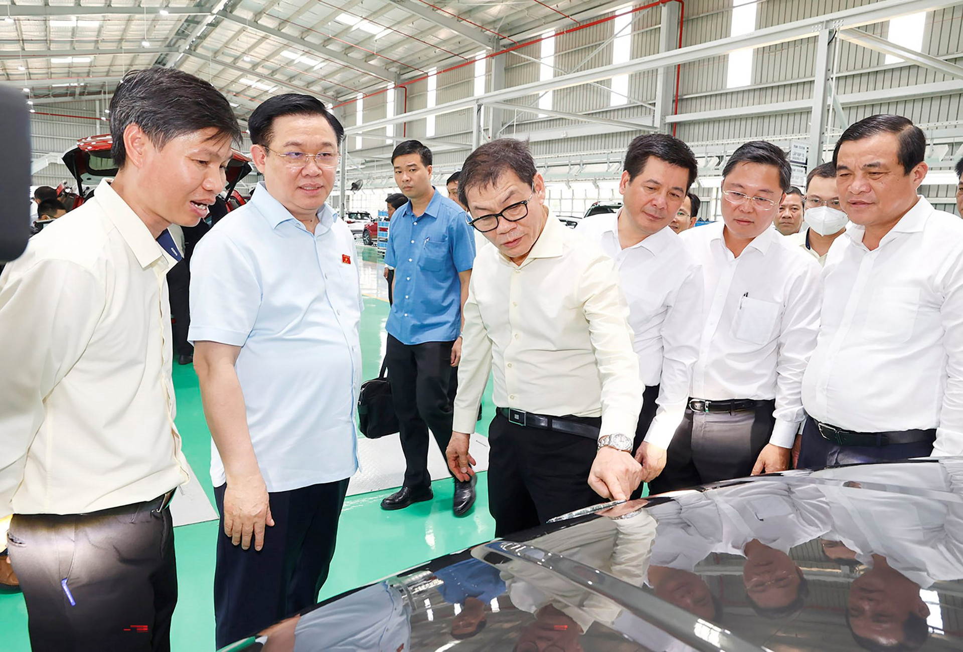 Ủy viên Bộ Chính trị, Chủ tịch Quốc hội Vương Đình Huệ thăm dây chuyền lắp giáp và sản xuất ô tô của Tập đoàn Trường Hải _Ảnh: TTXVN