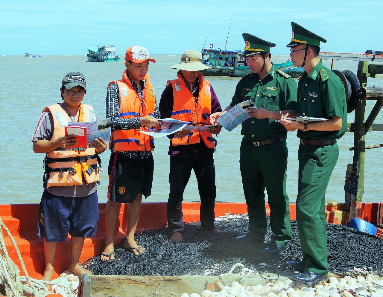 Cán bộ, chiến sĩ Bộ đội Biên phòng phát tờ rơi tuyên truyền pháp luật cho ngư dân_Ảnh: TTXVN