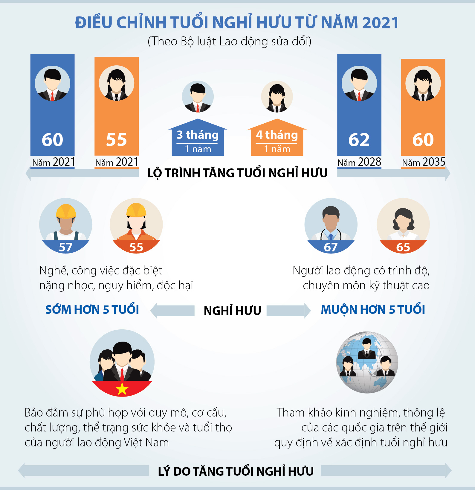 Quan điểm sửa đổi Bộ luật Lao động năm 2012 là thể chế hóa yêu cầu điều chỉnh tăng tuổi nghỉ hưu tại Nghị quyết số 28-NQ/TW, của Ban Chấp hành Trung ương Đảng khóa XII, về Cải cách chính sách bảo hiểm xã hội. Theo đó, từ năm 2021, thực hiện điều chỉnh tuổi nghỉ hưu theo mục tiêu tăng tuổi nghỉ hưu chung, thu hẹp dần khoảng cách về giới trong quy định tuổi nghỉ hưu; đối với những ngành, nghề đặc biệt, người lao động được quyền nghỉ hưu sớm, hoặc muộn hơn 5 tuổi so với tuổi nghỉ hưu chung.