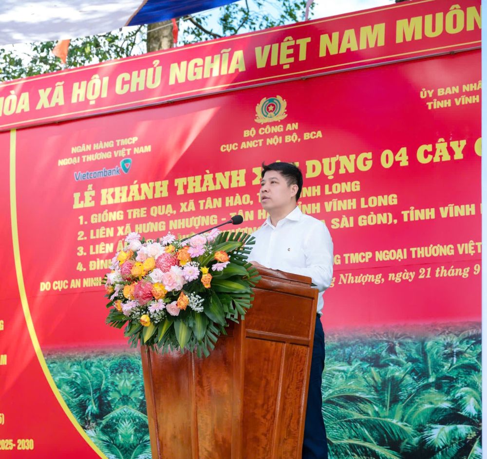 Phát biểu tại buổi lễ, đồng chí Hồng Quang, Ủy viên BCH Tổng Liên đoàn Lao động Việt Nam, Thành viên Hội đồng quản trị, Chủ tịch Công đoàn Vietcombank khẳng định: “Bốn cây cầu không chỉ là công trình giao thông đơn thuần, mà còn là "nhịp cầu nghĩa tình", là nhịp nối tình cảm giữa trái tim của những người cán bộ, nhân viên Vietcombank với bà con nơi đây. Những nhịp cầu ấy sẽ mở ra con đường thuận lợi cho việc đi lại, giao thương hàng hóa, thúc đẩy phát triển kinh tế - xã hội, góp phần hoàn thiện tiêu chí nông thôn mới của địa phương”.