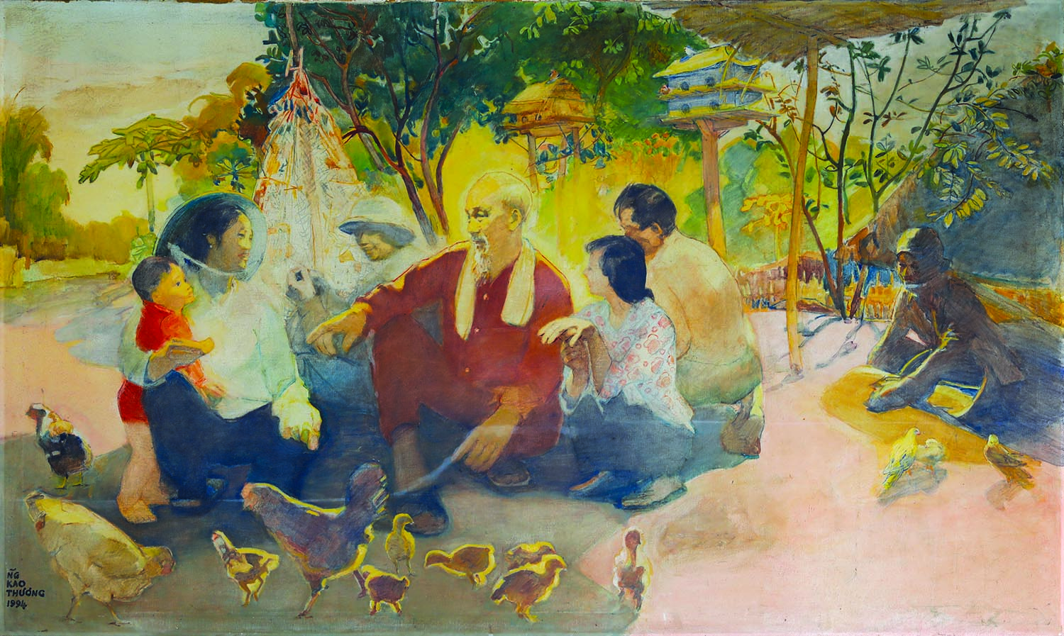 ລຸງໂຮ່ ຢ້ຽມຢາມບັນດາຄອບຄົວນັກຮົບເສຍອົງຄະ ທີ່ເຮັດການຜະລິດເກັ່ງ ຢູ່ ຕ່ຽນຫາຍ, ແຂວງ ຖາຍບິ່ງ (ຮູບແຕ້ມຂອງຈິດຕະກອນ ຫງວຽນ ກາວເທືອງ) _ພາບ: vnexpress.net
