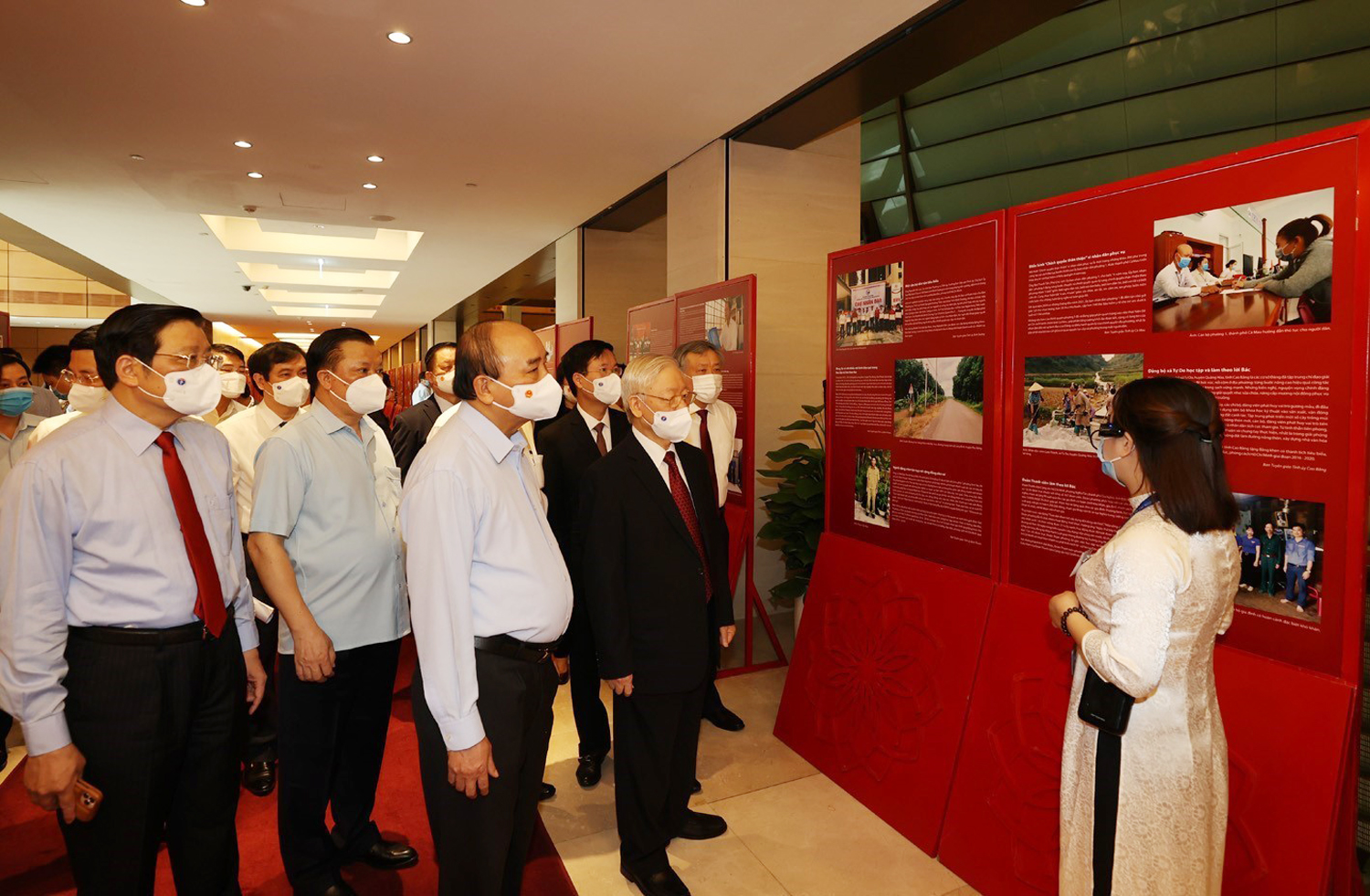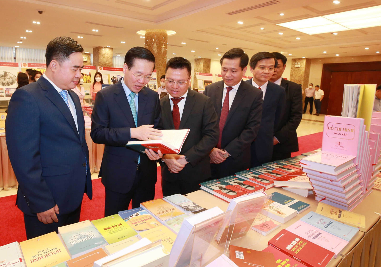 ສະຫາຍ ຫວໍ ວັນເຖືອງ ກຳມະການກົມການເມືອງ, ຜູ້ປະຈຳການຄະນະເລຂາທິການສູນກາງພັກ ແລະ ບັນດາຜູ້ແທນ ຢ້ຽມຊົມງານວາງສະແດງປຶ້ມແລະພາບ: “ຍົກສູງຄຸນສົມບັດປະຕິວັດ, ຂະຈັດລັດທິອັດຕະບຸກຄົນ ຕາມແນວຄິດ ຄຸນສົມບັດສິນທຳ ແລະ ແບບແຜນ ຂອງໂຮ່ຈີມິນ” ທີ່ຈັດຂຶ້ນໂດຍການປະສານງານລະຫວ່າງຄະນະພັກກຸ່ມອົງການສູນກາງ, ຄະນະພັກກຸ່ມວິສາຫະກິດສູນກາງ, ວາລະສານກອມມູນິດ ແລະ ໜັງສືພິມປະຊາຊົນ _ພາບ: TTXVN