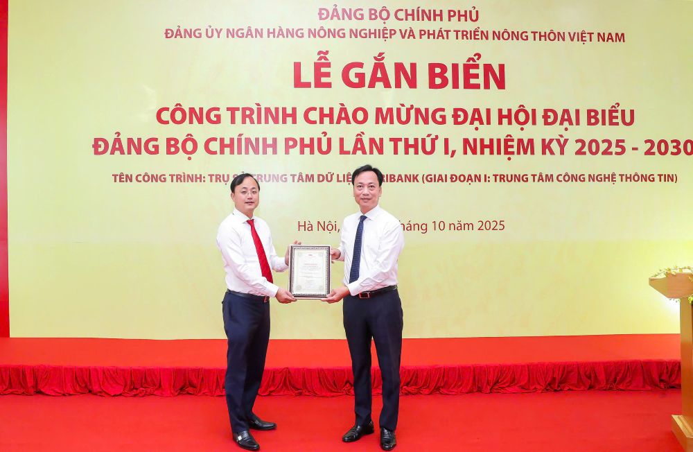 TCCS - Ngày 10-10-2025, tại Hà Nội, Đảng ủy Ngân hàng Nông nghiệp và Phát triển nông thôn Việt Nam (Agribank) đã tổ chức Lễ gắn biển công trình trụ sở Trung tâm dữ liệu Agribank. Đây là công trình được Đảng ủy Chính phủ công nhận gắn biển công trình chào mừng Đại hội đại biểu Đảng bộ Chính phủ lần thứ I, nhiệm kỳ 2025 - 2030.