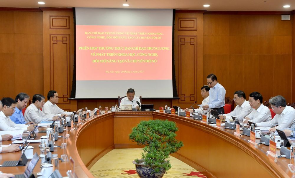 TCCS - Ngày 29-5-2025, tại trụ sở Trung ương Đảng, Tổng Bí thư Tô Lâm, Trưởng Ban Chỉ đạo Trung ương về phát triển khoa học, công nghệ, đổi mới sáng tạo và chuyển đổi số (Ban Chỉ đạo) đã chủ trì Phiên họp của Thường trực Ban Chỉ đạo.