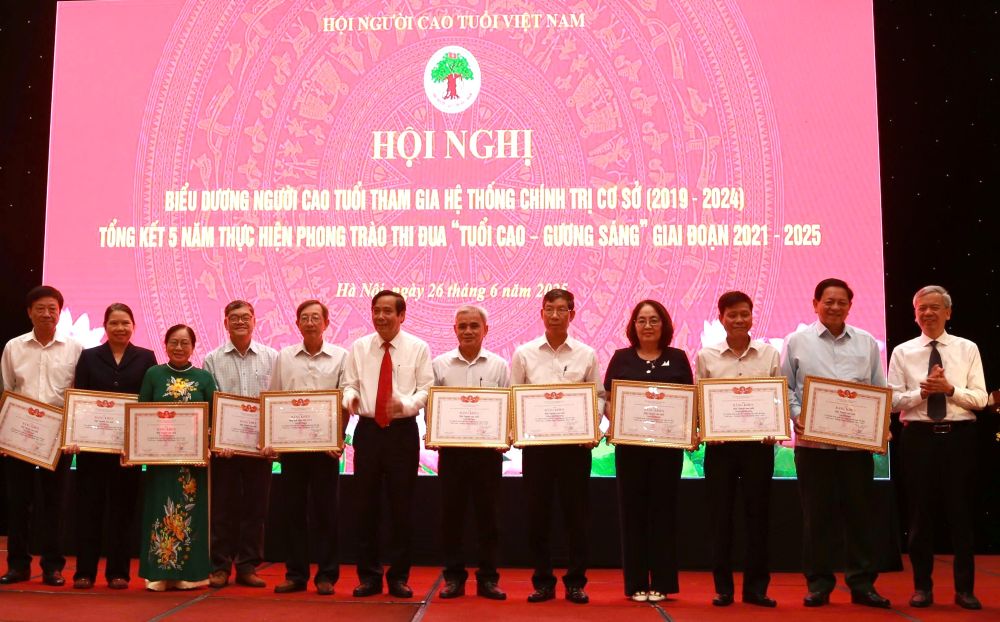 Nhân dịp này, Trung ương Hội Người cao tuổi Việt Nam trao tặng Bằng khen cho 252 cá nhân người cao tuổi tiêu biểu trong tham gia xây dựng hệ thống chính trị ở cơ sở; tặng Bằng khen cho 61 tập thể, 127 cá nhân có thành tích xuất sắc trong thực hiện phong trào thi đua "Tuổi cao - Gương sáng". Đây là những gương sáng tiêu biểu, thành tích nổi trội trong phong trào thi đua, là thành quả, sự nỗ lực phấn đấu của các cấp hội và toàn thể cán bộ, hội viên người cao tuổi trong 5 năm qua; đồng thời phát động phong trào thi đua “Tuổi cao - Gương sáng” giai đoạn 2025 - 2030./.