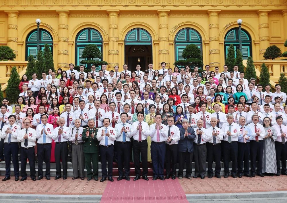 Ủy viên Bộ Chính trị, Chủ tịch nước Lương Cường và các nhà báo tiêu biểu toàn quốc_Ảnh: TTXVN