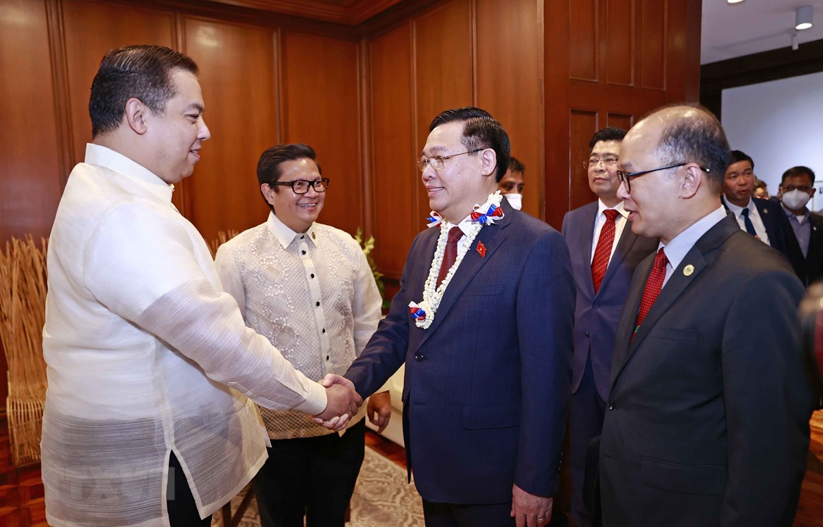 Thay mặt Đoàn đại biểu cấp cao Quốc hội Việt Nam, Chủ tịch Quốc hội Vương Đình Huệ bày tỏ vui mừng lần đầu tiên đến thăm đất nước Philippines tươi đẹp và giàu lòng mến khách; cảm ơn Chủ tịch Thượng viện Juan Miguel Zubiri và Chủ tịch Hạ viện Philippines Martin Romualdez về sự đón tiếp chu đáo và trọng thị, thân tình; chúc mừng đất nước; chúc mừng Philippines đã tổ chức thành công tổng tuyển cử ngày 9-5-2022 và cá nhân các ông Martin Romualdez được bầu làm Chủ tịch Hạ viện Philippines và ông Juan Miguel Zubiri đã được bầu làm Chủ tịch Thượng viện Philippines; tin rằng dưới sự lãnh đạo của Tổng thống, Chủ tịch Thượng viện và Chủ tịch Hạ viện, đất nước Philippines sẽ ngày càng phồn vinh, thịnh vượng; vai trò và vị thế ngày càng cao ở khu vực và trên quốc tế.