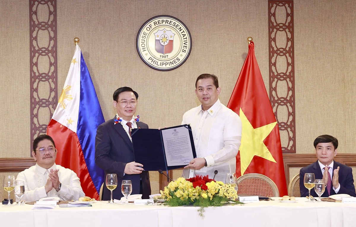 Tại cuộc hội đàm, thực hiện chỉ đạo của Chủ tịch Hạ viện Martin Romualdez, trước sự chứng kiến của các nghị sĩ hai nước, đại diện Hạ viện Philippines đã trang trọng đọc toàn văn Nghị quyết 571 về việc tăng cường hợp tác giữa Philippines và Việt Nam thông qua Nhóm nghị sĩ hữu nghị Philippines - Việt Nam vừa được toàn bộ đại biểu Hạ viện Philippines đồng ý thông qua, trong đó nhấn mạnh trong 10 nghị viện thành viên Đại hội đồng Liên nghị viện các quốc gia Đông Nam Á (AIPA), Philippines và Việt Nam đã xây dựng được quan hệ đặc biệt qua nhiều năm, dựa trên những giá trị, tầm nhìn và lợi ích chung, vì lợi ích của người dân hai nước và cùng nhau hướng tới hòa bình và hiệu quả trong hợp tác khu vực. Philippines đánh giá cao tầm quan trọng của việc duy trì tình hữu nghị với các quốc gia thành viên khác, đặc biệt là với Việt Nam và tình hữu nghị, đoàn kết và hợp tác lâu dài với các quốc gia Đông Nam Á là cấu phần quan trọng để đạt được hòa bình và thịnh vượng trong khu vực