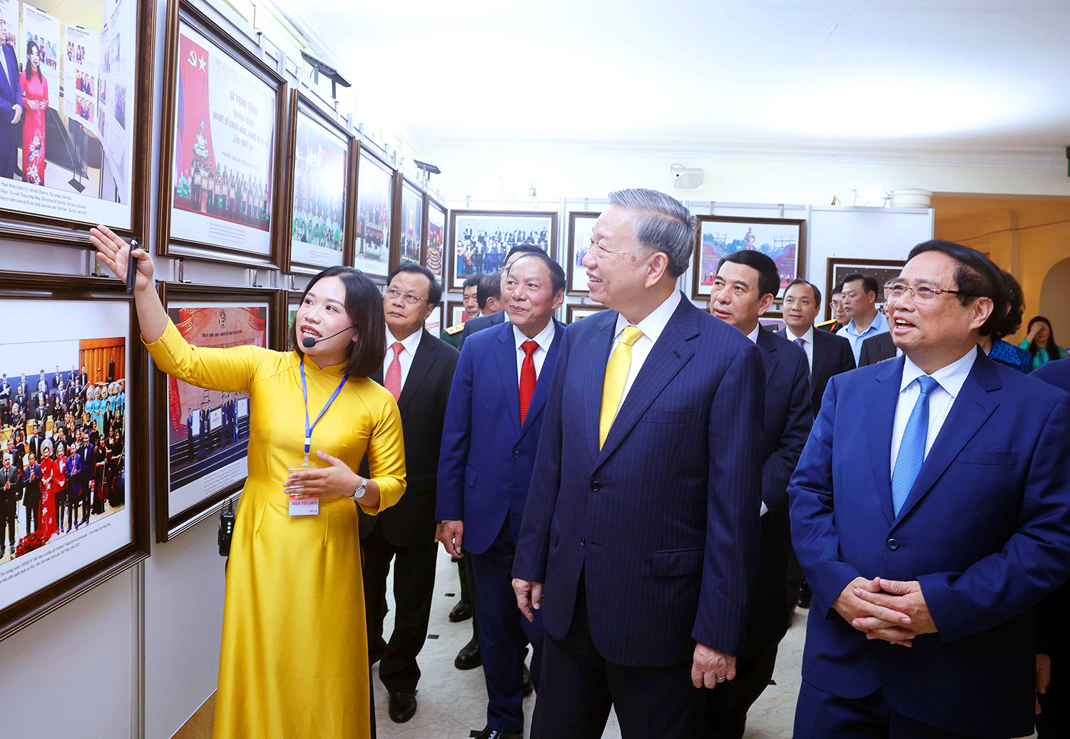 Tổng Bí thư Tô Lâm và các đại biểu xem trưng bày ảnh tại Lễ kỷ niệm 80 năm Ngày truyền thống ngành văn hoá _Ảnh: TTXVN