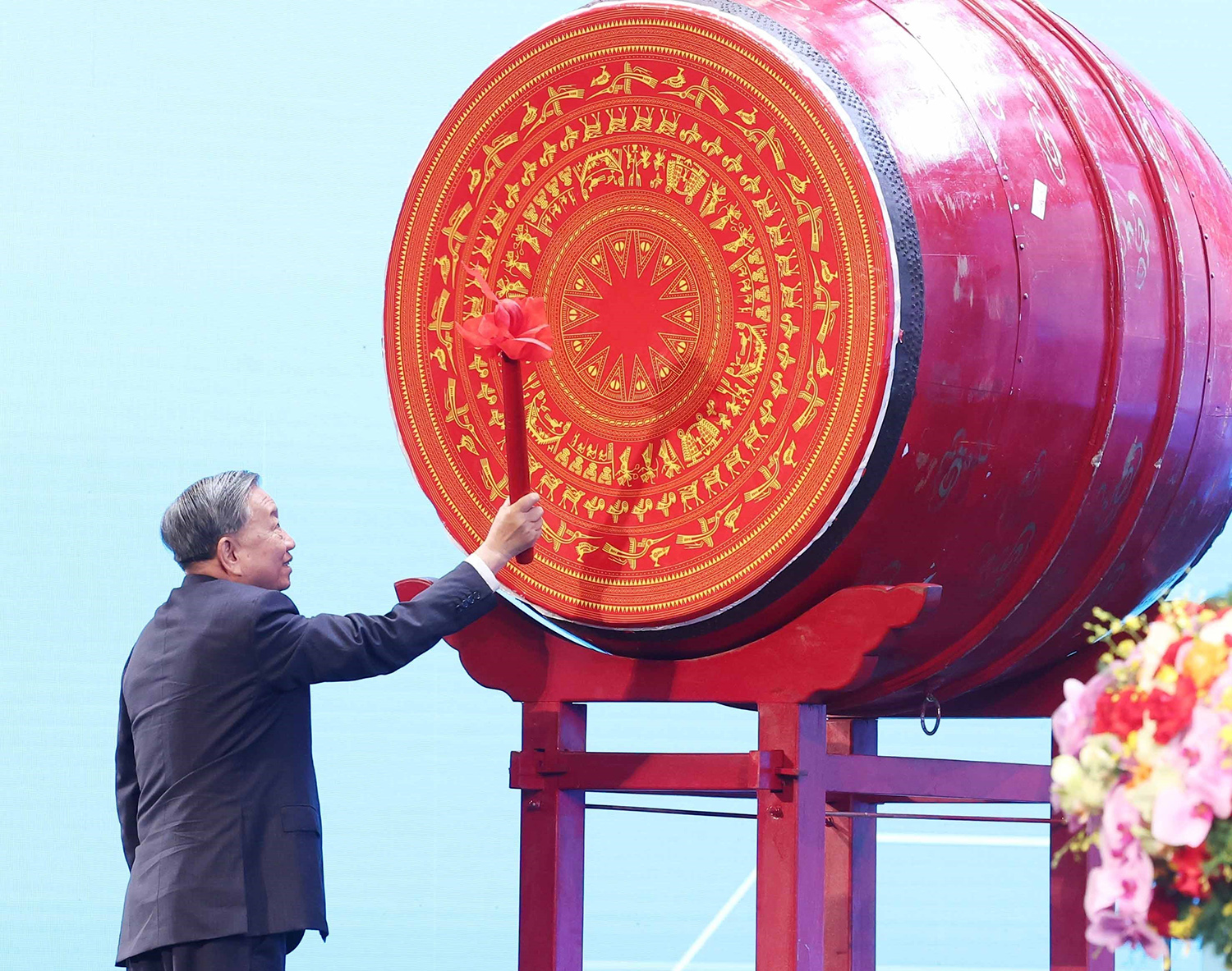 Tổng Bí thư Tô Lâm đánh trống khai giảng năm học mới 2025 - 2026 _Ảnh: TTXVN