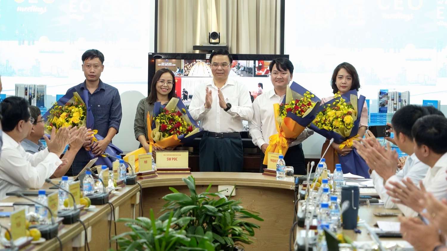 Tổng Giám đốc Tập đoàn Dầu khí Việt Nam Lê Mạnh Hùng tặng hoa chúc mừng và biểu dương đại diện các nhà báo, tác giả sách Nhật ký Ceo Meetings_Nguồn: PVN