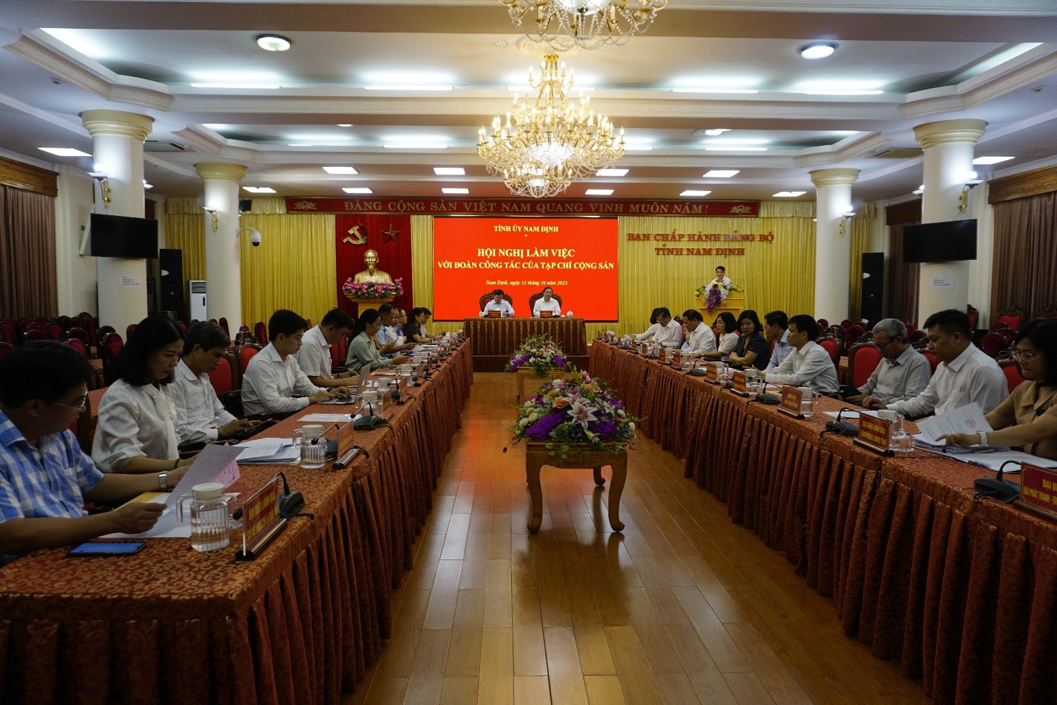 Đồng chí Phạm Gia Túc, Ủy viên Trung ương Đảng, Bí thư Tỉnh ủy Nam Định và đồng chí PGS, TS Phạm Minh Tuấn, Phó Tổng Biên tập, phụ trách Tạp chí Cộng sản chủ trì buổi làm việc. Tham dự buổi làm việc còn có các lãnh đạo, biên tập viên các ban chuyên môn của Tạp chí Cộng sản, các đồng chí Ủy viên Ban Thường vụ Tỉnh ủy, đại diện lãnh đạo một số sở, ban, ngành của tỉnh Nam Định.