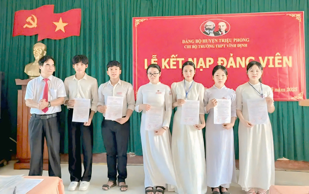 Lễ kết nạp đảng viên cho học sinh ưu tú tuổi 18 của Chi bộ Trường Trung học phổ thông Vĩnh Định (huyện Triệu Phong, tỉnh Quảng Trị) năm 2025_Ảnh: baoquangtri.vn