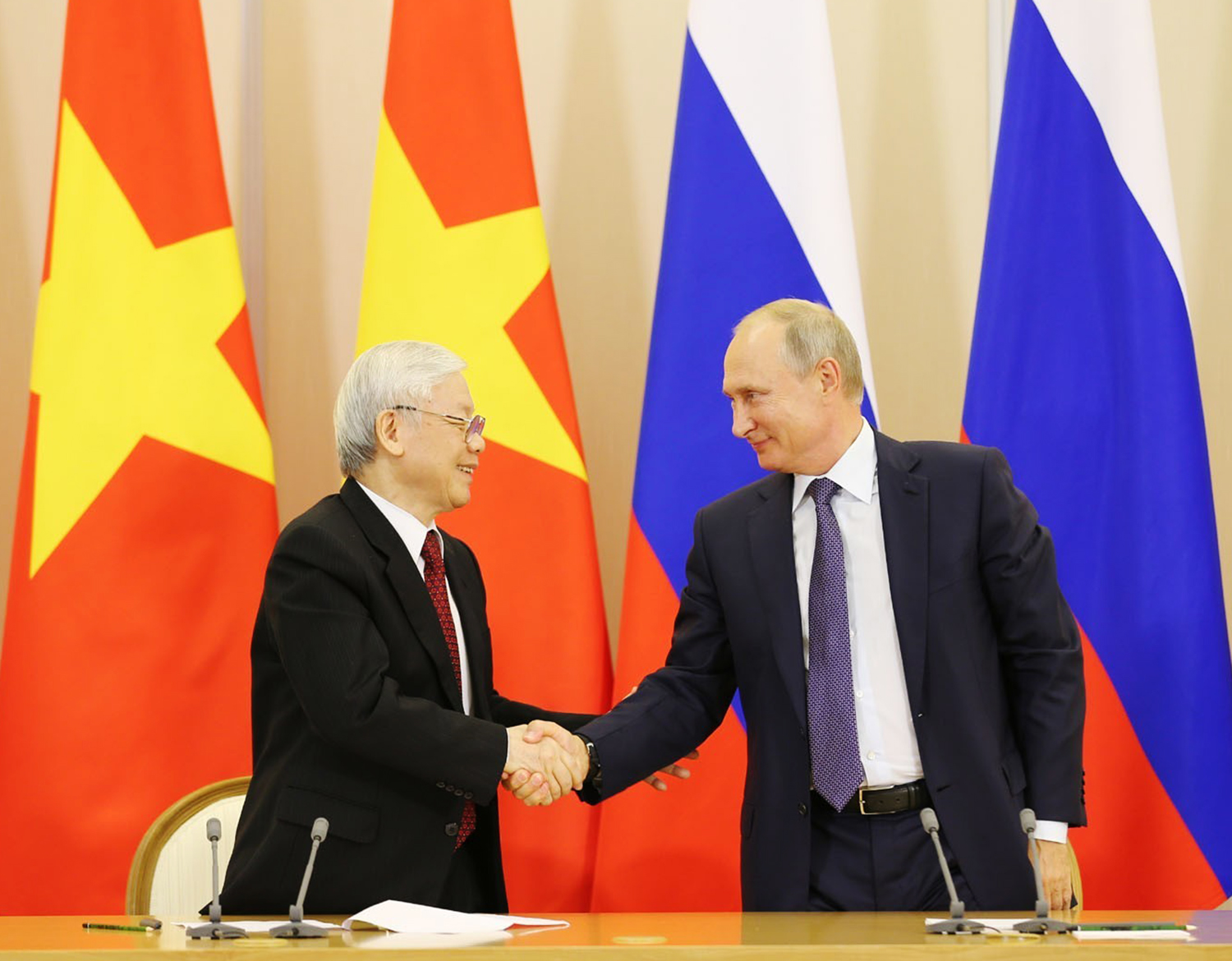 Tổng Bí thư Nguyễn Phú Trọng và Tổng thống Nga Vladimir Putin tại lễ ký các văn kiện hợp tác giữa hai nước trong khuôn khổ chuyến thăm Nga của Tổng Bí thư, năm 2018 _Ảnh: TTXVN