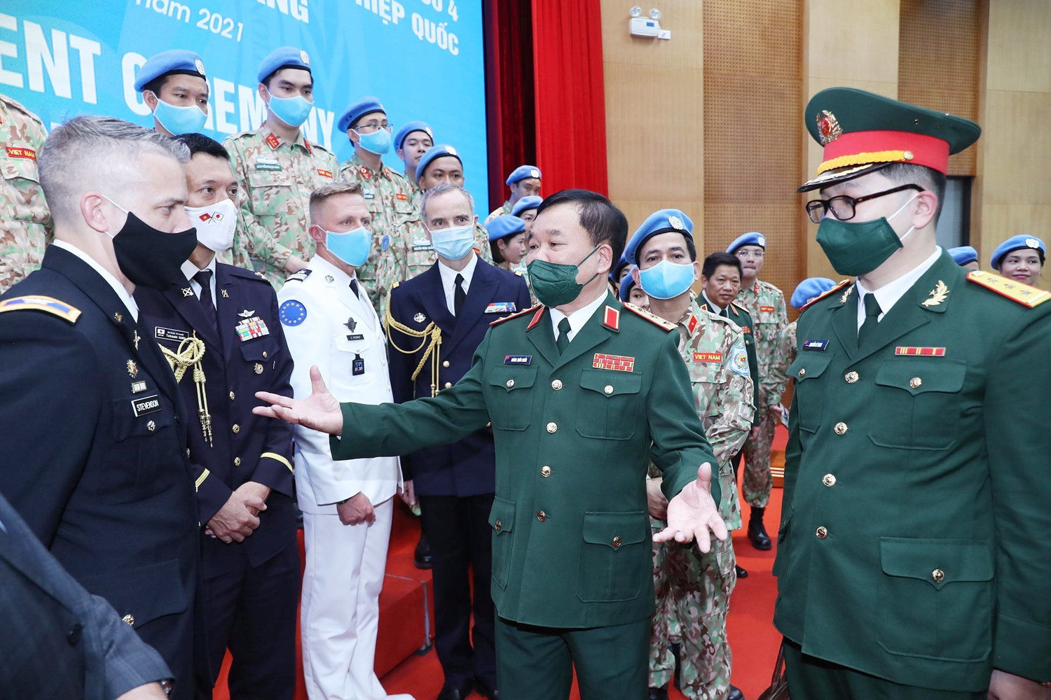 Thượng tướng Hoàng Xuân Chiến, Ủy viên Trung ương Đảng, Thứ trưởng Bộ Quốc phòng cùng đại diện các bộ, ngành và tùy viên quân sự các nước tại Việt Nam dự Lễ ra mắt Đội công binh số 1 và Bệnh viện dã chiến cấp 2 số 4 tham gia hoạt động gìn giữ hòa bình Liên hợp quốc tại Abyei và Nam Sudan _Ảnh: TTXVN