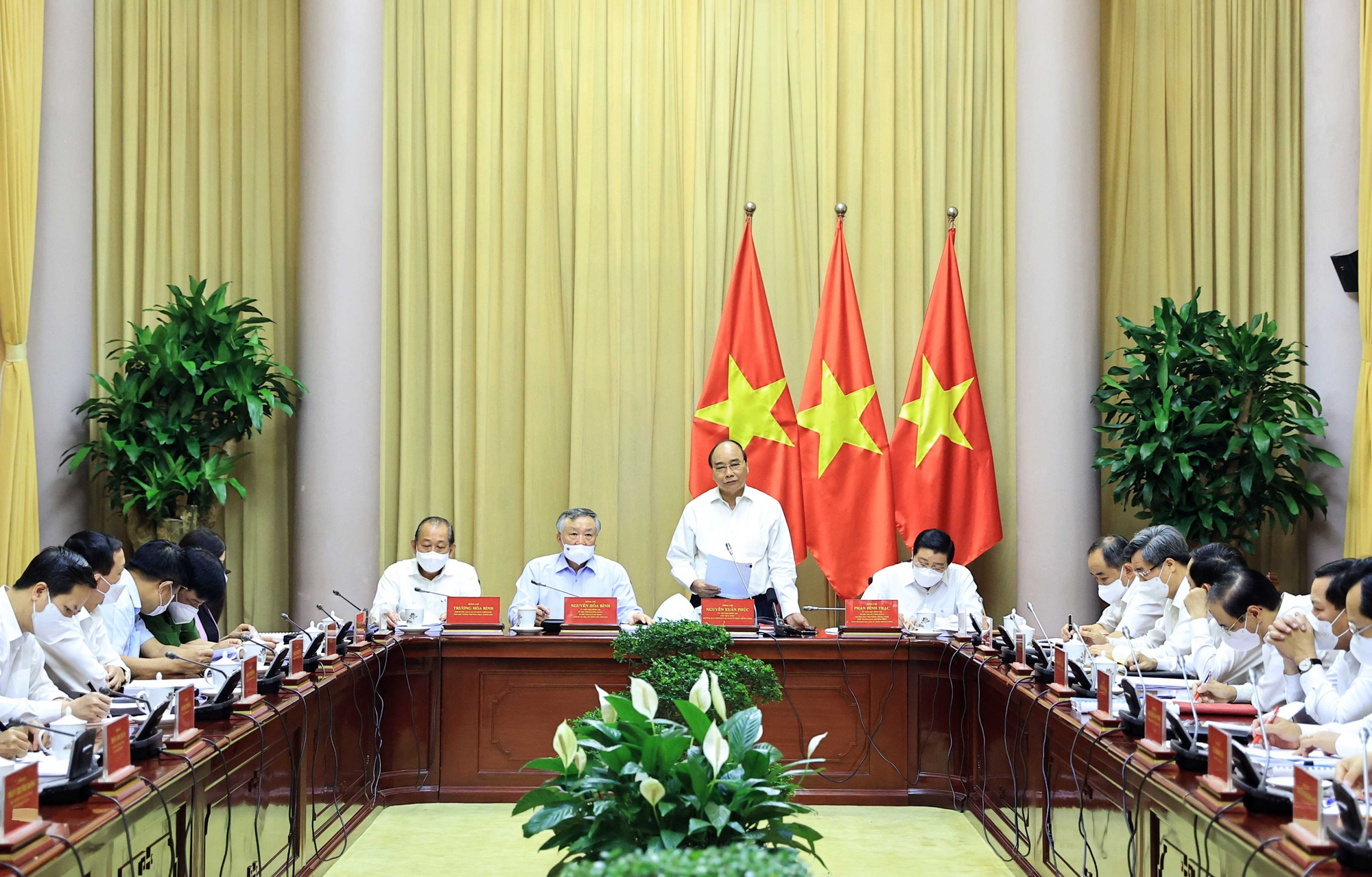 Ủy viên Bộ Chính trị, Chủ tịch nước Nguyễn Xuân Phúc, Trưởng Ban Chỉ đạo Cải cách tư pháp Trung ương làm việc với Ban cán sự đảng Tòa án nhân dân tối cao về dự thảo đề án “Đổi mới tổ chức bộ máy toàn án nhân dân tinh gọn, hoạt động hiệu lực, hiệu quả", ngày 7-6-2021 _Ảnh: TTXVN