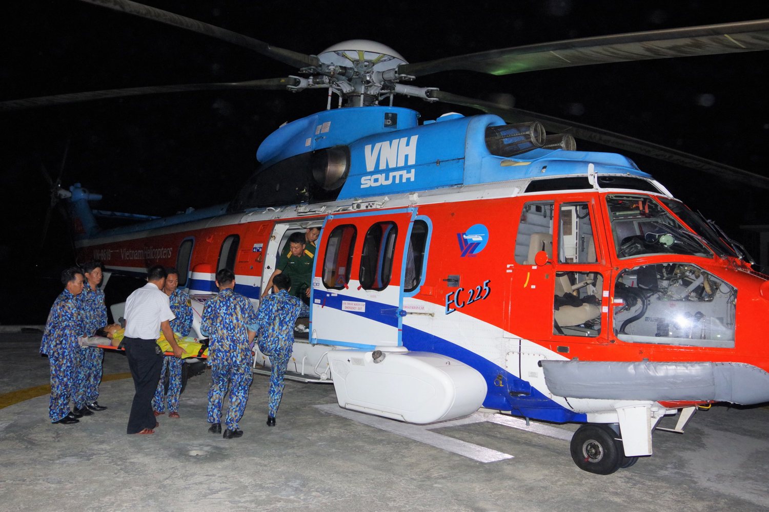 Bệnh viện Quân y 175 phối hợp với Tổng Công ty Trực thăng Việt Nam (Binh đoàn 18, Bộ Quốc phòng) dùng trực thăng đưa bệnh nhân bệnh nặng từ đảo Song Tử Tây và đảo An Bang (thuộc huyện đảo Trường Sa, tỉnh Khánh Hòa) về đất liền cấp cứu _Ảnh: TTXVN
