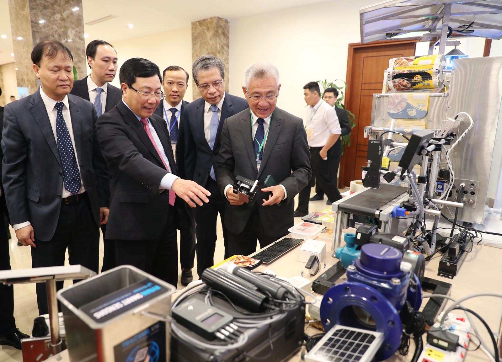 Ủy viên Bộ Chính trị, Phó Thủ tướng Chính phủ, Bộ trưởng Bộ Ngoại giao Phạm Bình Minh và các đại biểu tham quan trưng bày sản phẩm của các doanh nghiệp là người Việt Nam ở nước ngoài đang đầu tư tại Việt Nam bên lề Hội nghị sơ kết 5 năm thực hiện Chỉ thị số 45-CT/TW về công tác đối với người Việt Nam ở nước ngoài trong tình hình mới, tháng 11-2020 _Ảnh: TTXVN