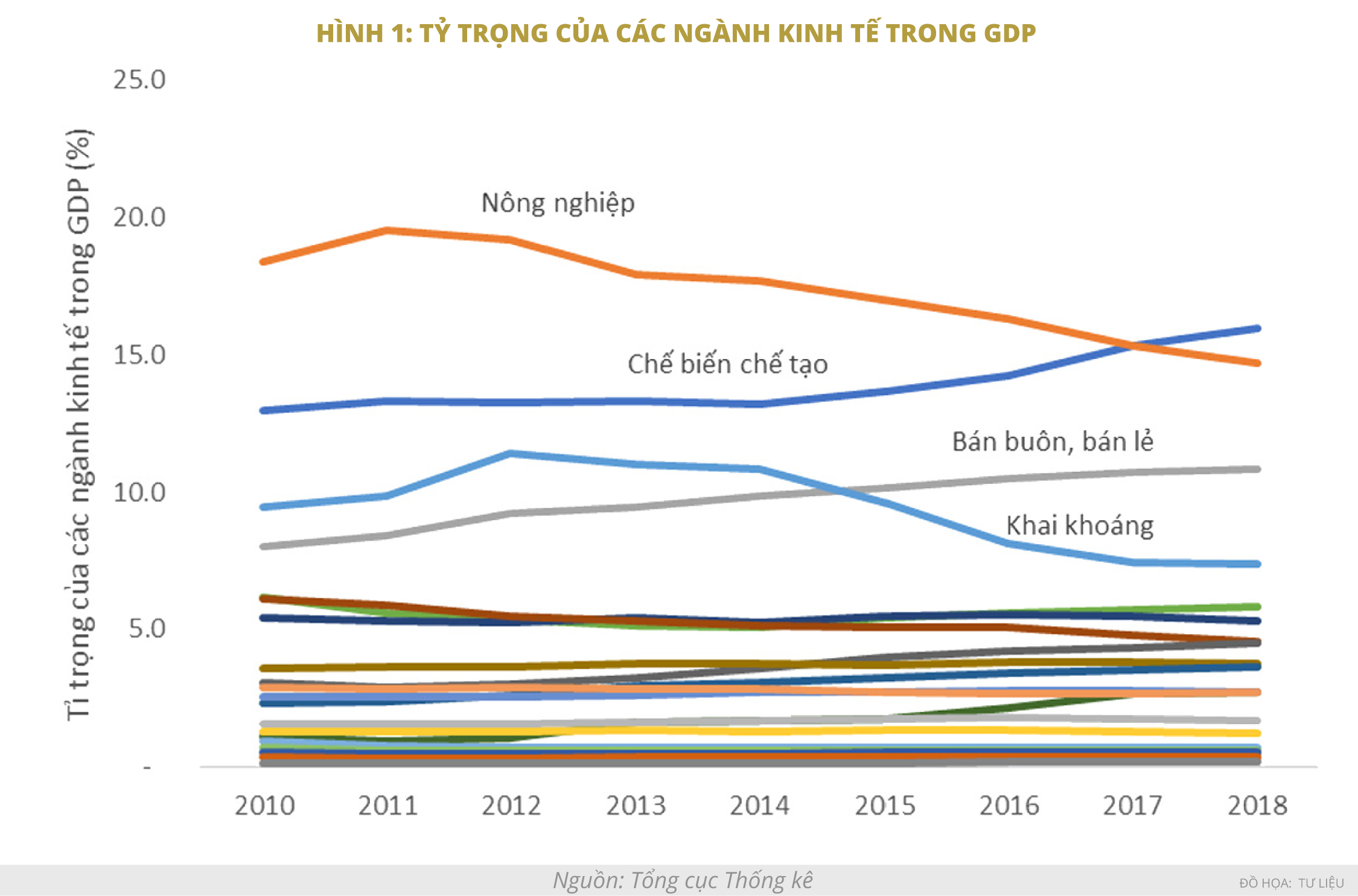 Xét về mức độ đóng góp vào GDP của các ngành kinh tế, số liệu thống kê từ năm 2010 đến nay cho thấy, cơ cấu nền kinh tế Việt Nam đang có sự chuyển đổi tích cực theo hướng công nghiệp hóa, với sự giảm dần của nông nghiệp và tăng dần của công nghiệp và dịch vụ. Bốn ngành có đóng góp lớn nhất cho nền kinh tế gồm CBCT, nông nghiệp, bán buôn, bán lẻ, và khoáng sản. Các ngành còn lại đều có mức đóng góp dưới 5%. Như vậy có thể thấy, công nghiệp CBCT đã đóng vai trò động lực cho phát triển của nền kinh tế trong thời gian vừa qua (Xem hình 1).
